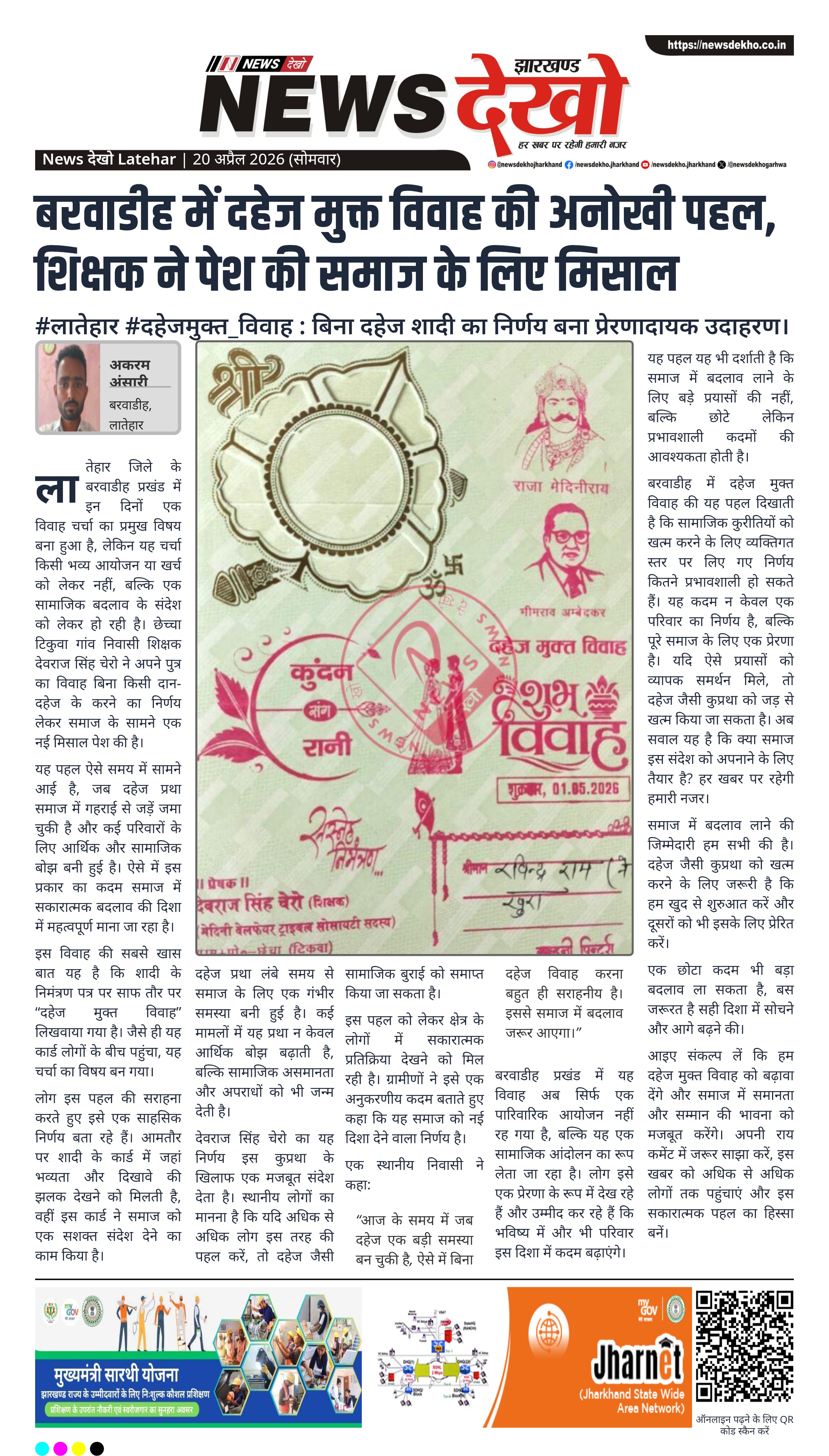 लातेहार जिले के बरवाडीह प्रखंड में इन दिनों एक विवाह चर्चा का प्रमुख विषय बना हुआ है, लेकिन यह चर्चा किसी भव्य आयोजन या खर्च को लेकर नहीं, बल्कि एक सामाजिक बदलाव के संदेश को लेकर हो रही है। छेच्चा टिकुवा गांव निवासी शिक्षक देवराज सिंह चेरो ने अपने पुत्र का विवाह बिना किसी दान-दहेज के करने का निर्णय लेकर समाज के सामने एक नई मिसाल पेश की है।