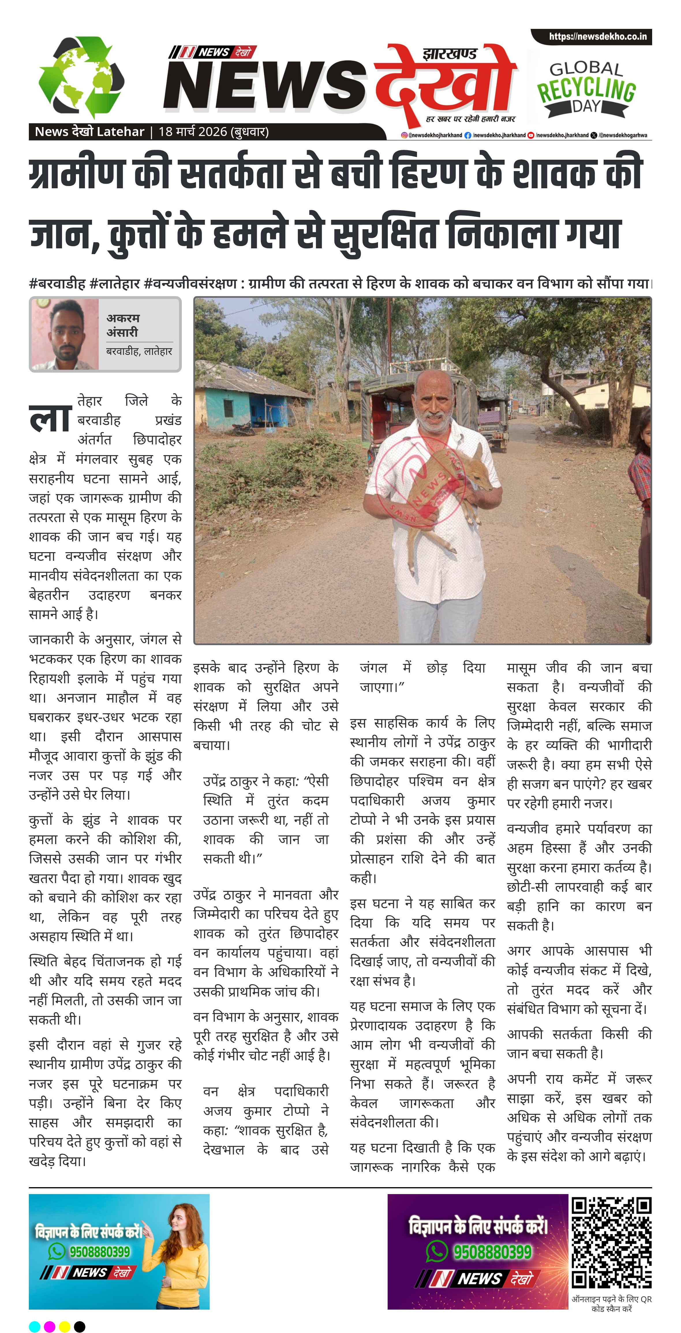 लातेहार जिले के बरवाडीह प्रखंड अंतर्गत छिपादोहर क्षेत्र में मंगलवार सुबह एक सराहनीय घटना सामने आई, जहां एक जागरूक ग्रामीण की तत्परता से एक मासूम हिरण के शावक की जान बच गई। यह घटना वन्यजीव संरक्षण और मानवीय संवेदनशीलता का एक बेहतरीन उदाहरण बनकर सामने आई है।