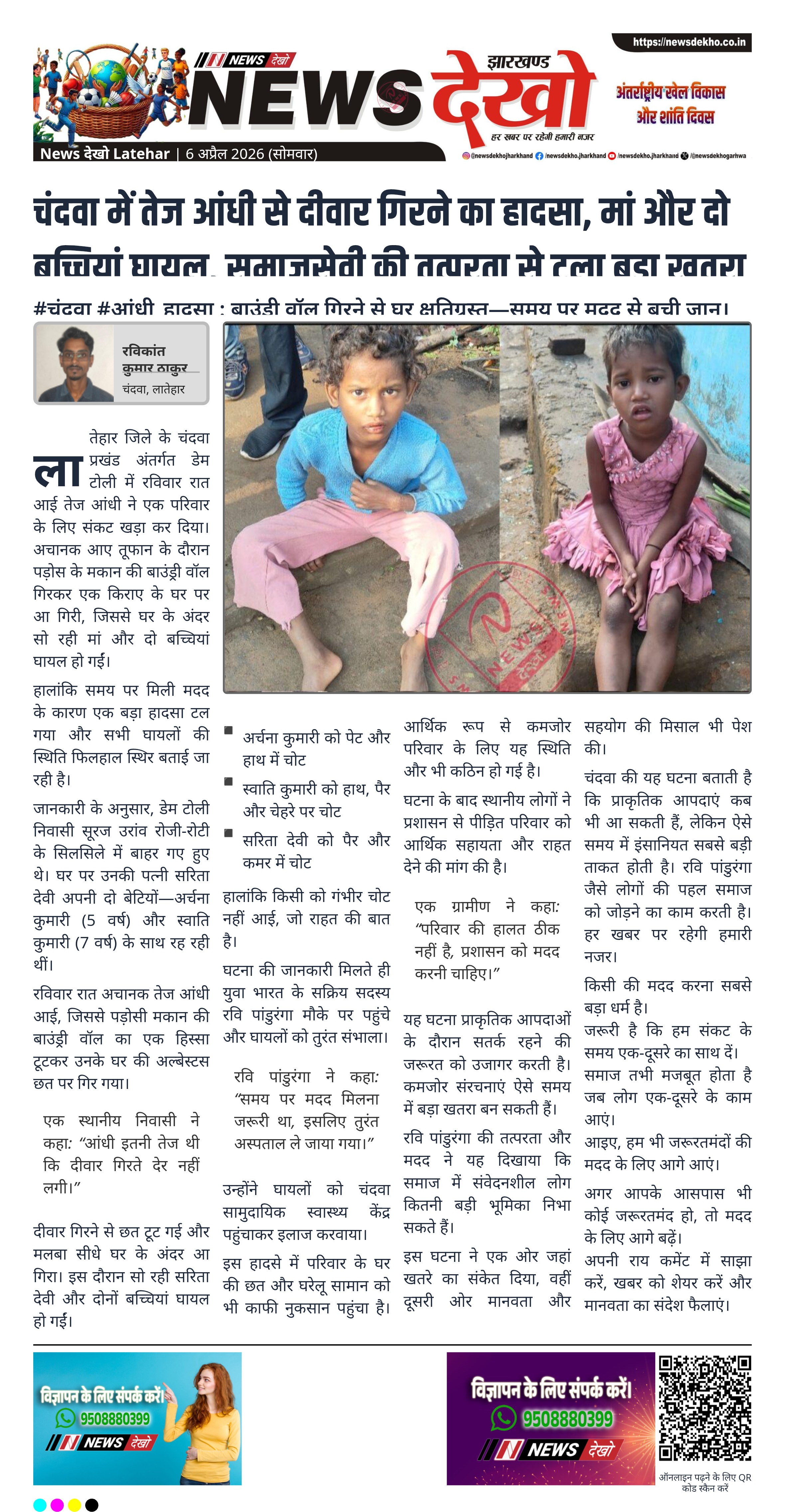 लातेहार के चंदवा प्रखंड के डेम टोली में तेज आंधी के कारण बाउंड्री वॉल गिरने से एक परिवार घायल हो गया। हादसे में मां और दो बच्चियां जख्मी हुईं। समाजसेवी रवि पांडुरंगा ने तुरंत अस्पताल पहुंचाकर मदद की। घटना में घर को भी नुकसान हुआ और परिवार ने सहायता की मांग की है।