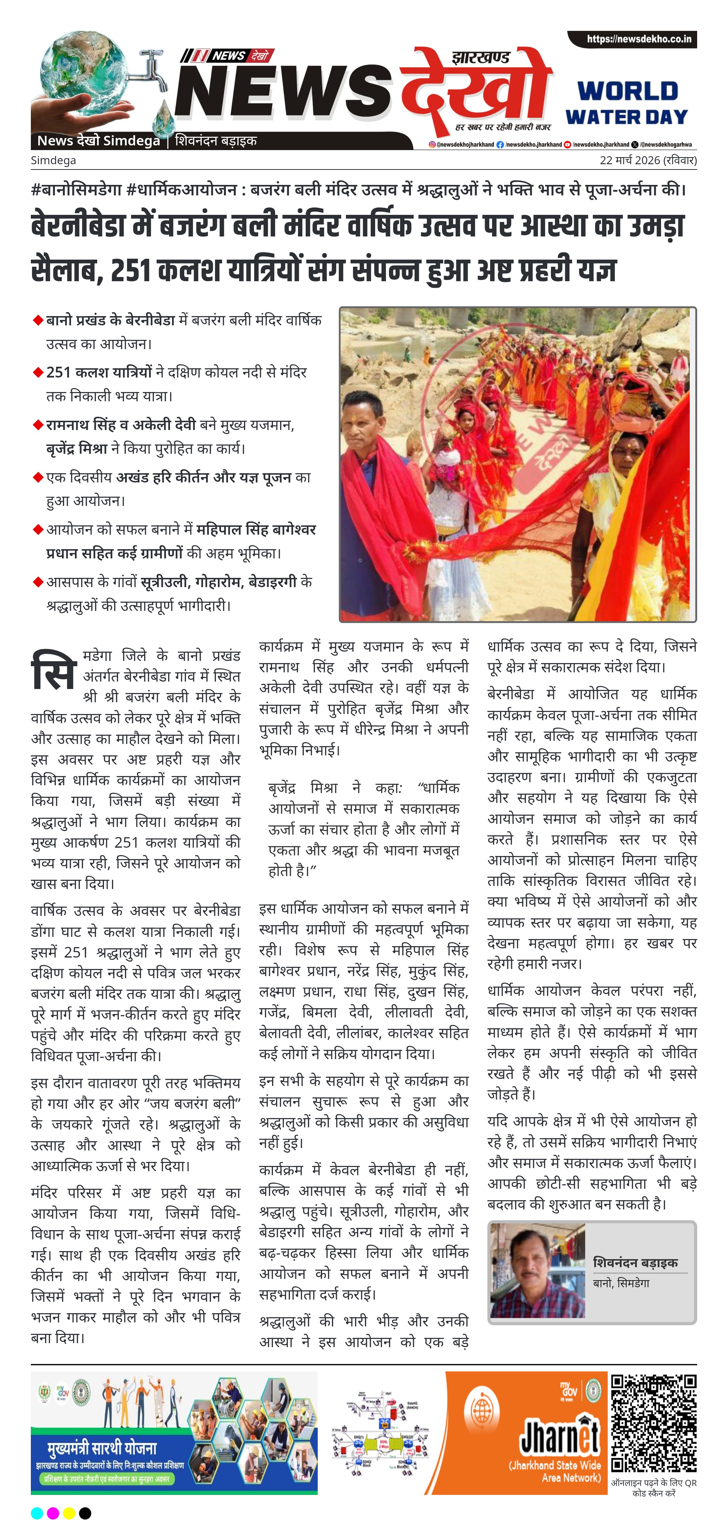 सिमडेगा जिले के बानो प्रखंड स्थित बेरनीबेडा में श्री श्री बजरंग बली मंदिर के वार्षिक उत्सव के अवसर पर अष्ट प्रहरी यज्ञ का आयोजन किया गया। कार्यक्रम में 251 श्रद्धालुओं ने कलश यात्रा में भाग लिया, जो दक्षिण कोयल नदी से मंदिर तक पहुंची। पूरे आयोजन में क्षेत्र के श्रद्धालुओं की सक्रिय भागीदारी रही। यह आयोजन धार्मिक आस्था और सामाजिक एकता का प्रतीक बनकर उभरा।