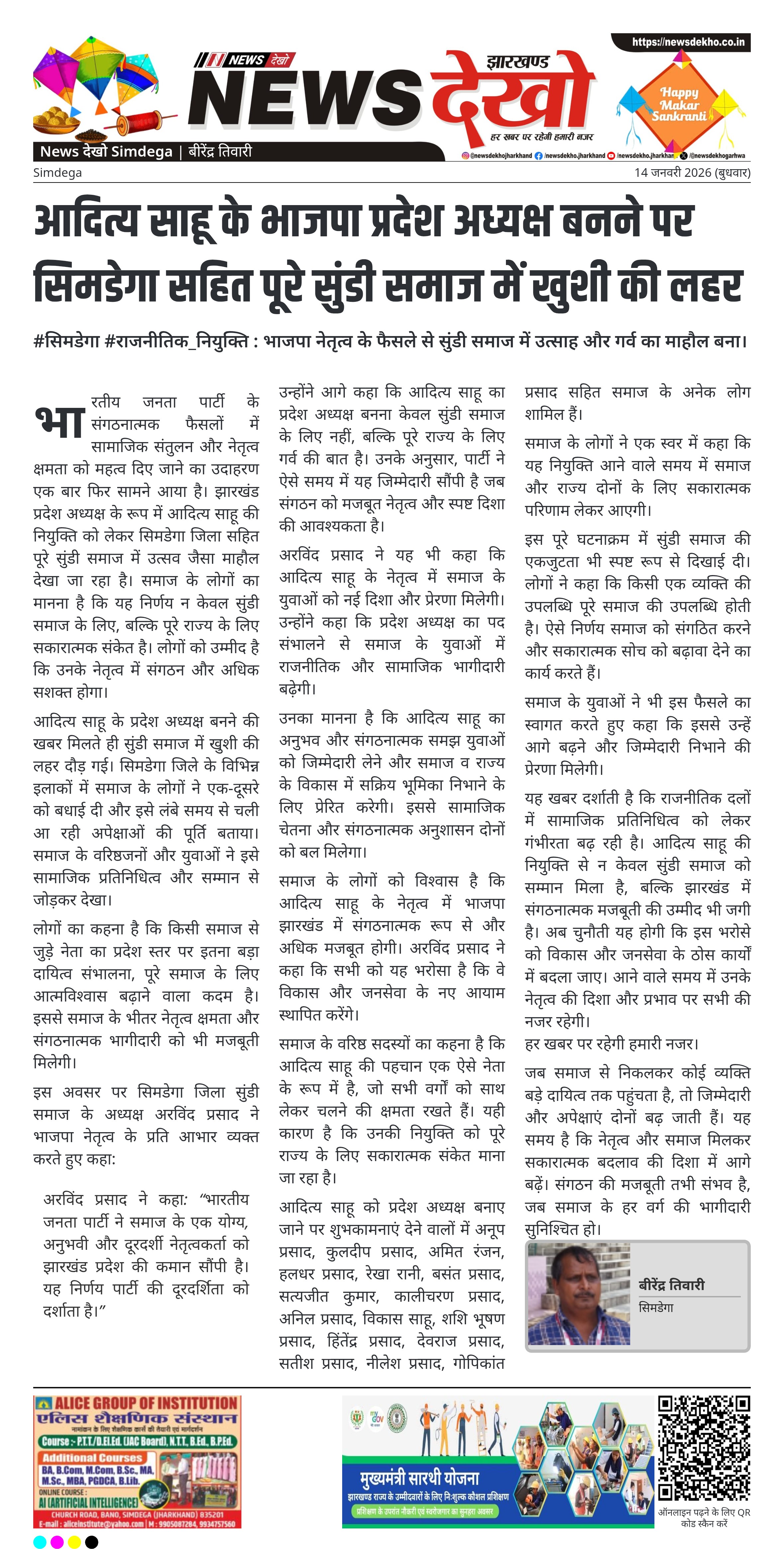 भारतीय जनता पार्टी के संगठनात्मक फैसलों में सामाजिक संतुलन और नेतृत्व क्षमता को महत्व दिए जाने का उदाहरण एक बार फिर सामने आया है। झारखंड प्रदेश अध्यक्ष के रूप में आदित्य साहू की नियुक्ति को लेकर सिमडेगा जिला सहित पूरे सुंडी समाज में उत्सव जैसा माहौल देखा जा रहा है। समाज के लोगों का मानना है कि यह निर्णय न केवल सुंडी समाज के लिए, बल्कि पूरे राज्य के लिए सकारात्मक संकेत है। लोगों को उम्मीद है कि उनके नेतृत्व में संगठन और अधिक सशक्त होगा।