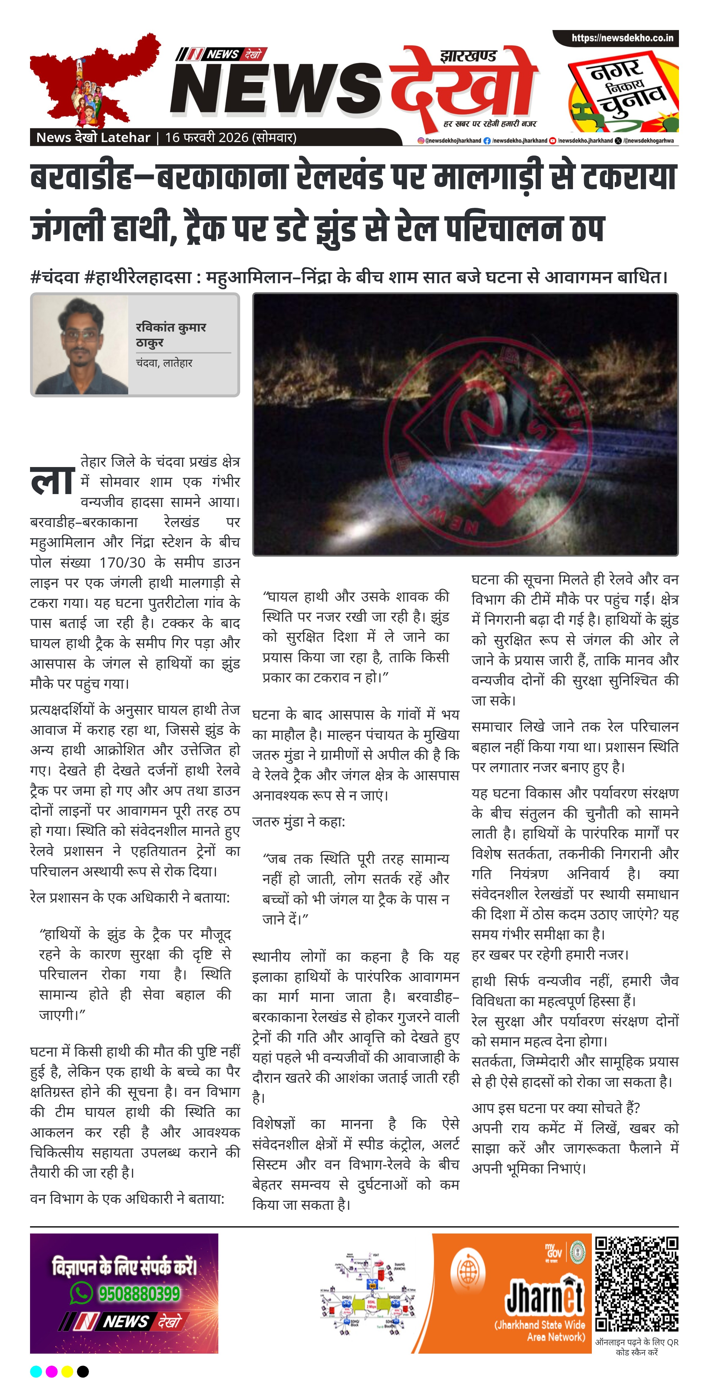 लातेहार जिले के चंदवा क्षेत्र में बरवाडीह–बरकाकाना रेलखंड पर सोमवार शाम एक जंगली हाथी मालगाड़ी की चपेट में आकर घायल हो गया। महुआमिलान और निंद्रा स्टेशन के बीच पुतरीटोला गांव के पास हुई घटना के बाद हाथियों का झुंड ट्रैक पर डटा रहा, जिससे रेल परिचालन रोकना पड़ा। वन विभाग और रेलवे की टीमें मौके पर स्थिति संभाल रही हैं।