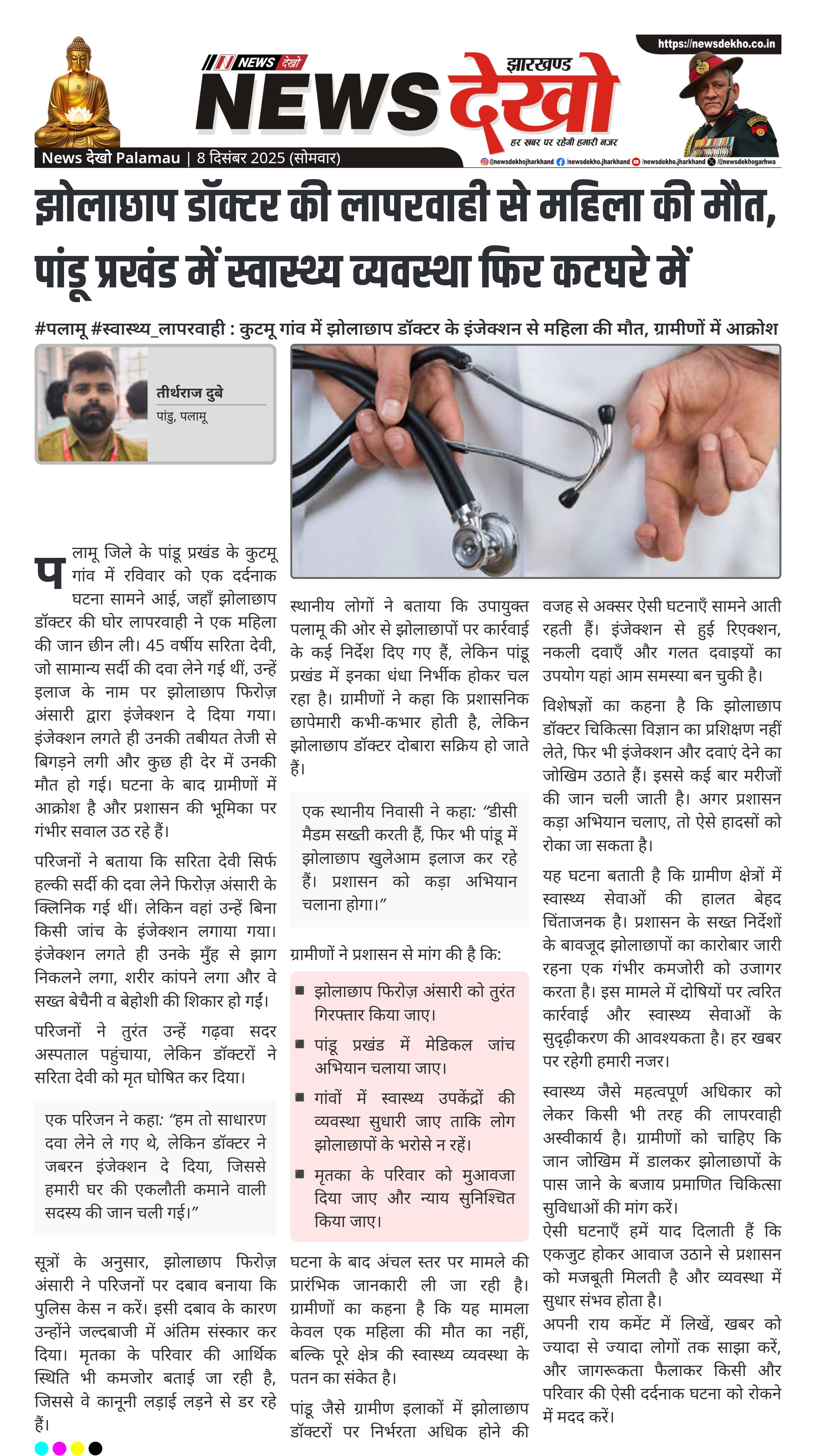 #पलामू #स्वास्थ्य_लापरवाही : कुटमू गांव में झोलाछाप डॉक्टर के इंजेक्शन से महिला की मौत, ग्रामीणों में आक्रोश