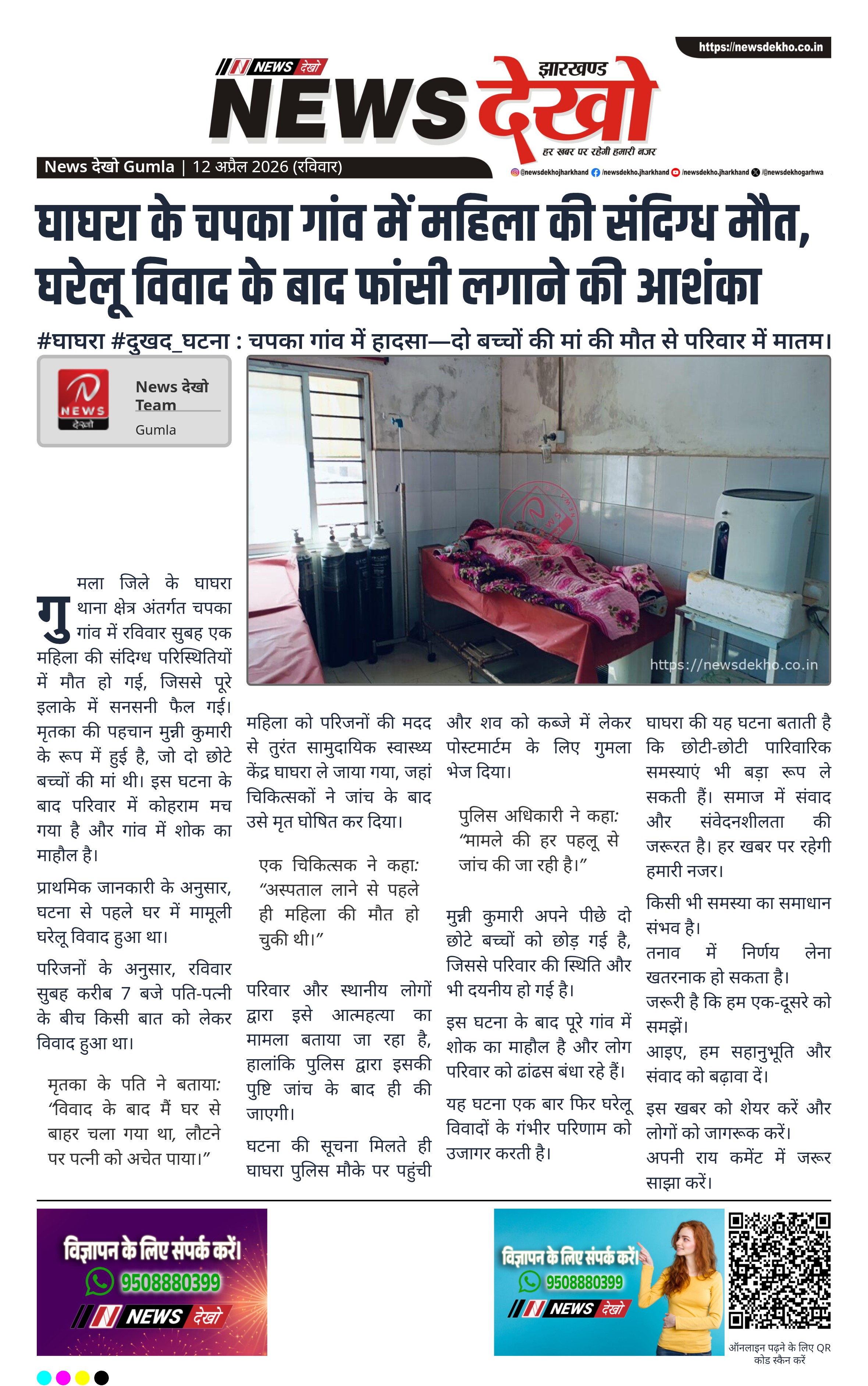 गुमला जिले के घाघरा थाना क्षेत्र अंतर्गत चपका गांव में रविवार सुबह एक महिला की संदिग्ध परिस्थितियों में मौत हो गई, जिससे पूरे इलाके में सनसनी फैल गई। मृतका की पहचान मुन्नी कुमारी के रूप में हुई है, जो दो छोटे बच्चों की मां थी। इस घटना के बाद परिवार में कोहराम मच गया है और गांव में शोक का माहौल है।
