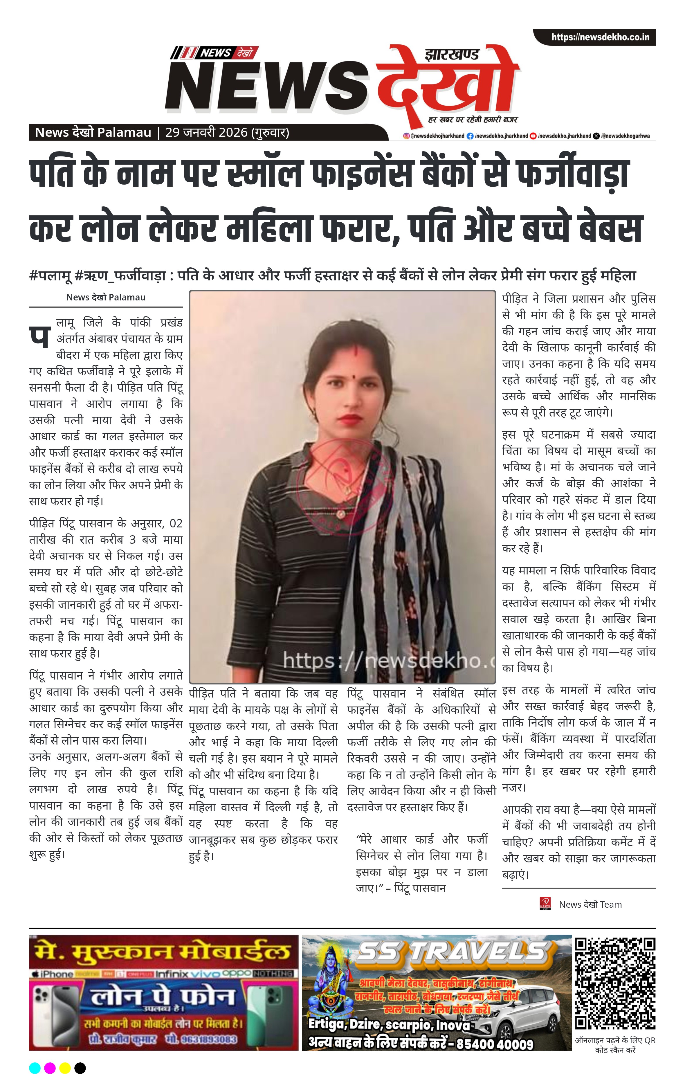 #पलामू #ऋण_फर्जीवाड़ा : पति के आधार और फर्जी हस्ताक्षर से कई बैंकों से लोन लेकर प्रेमी संग फरार हुई महिला