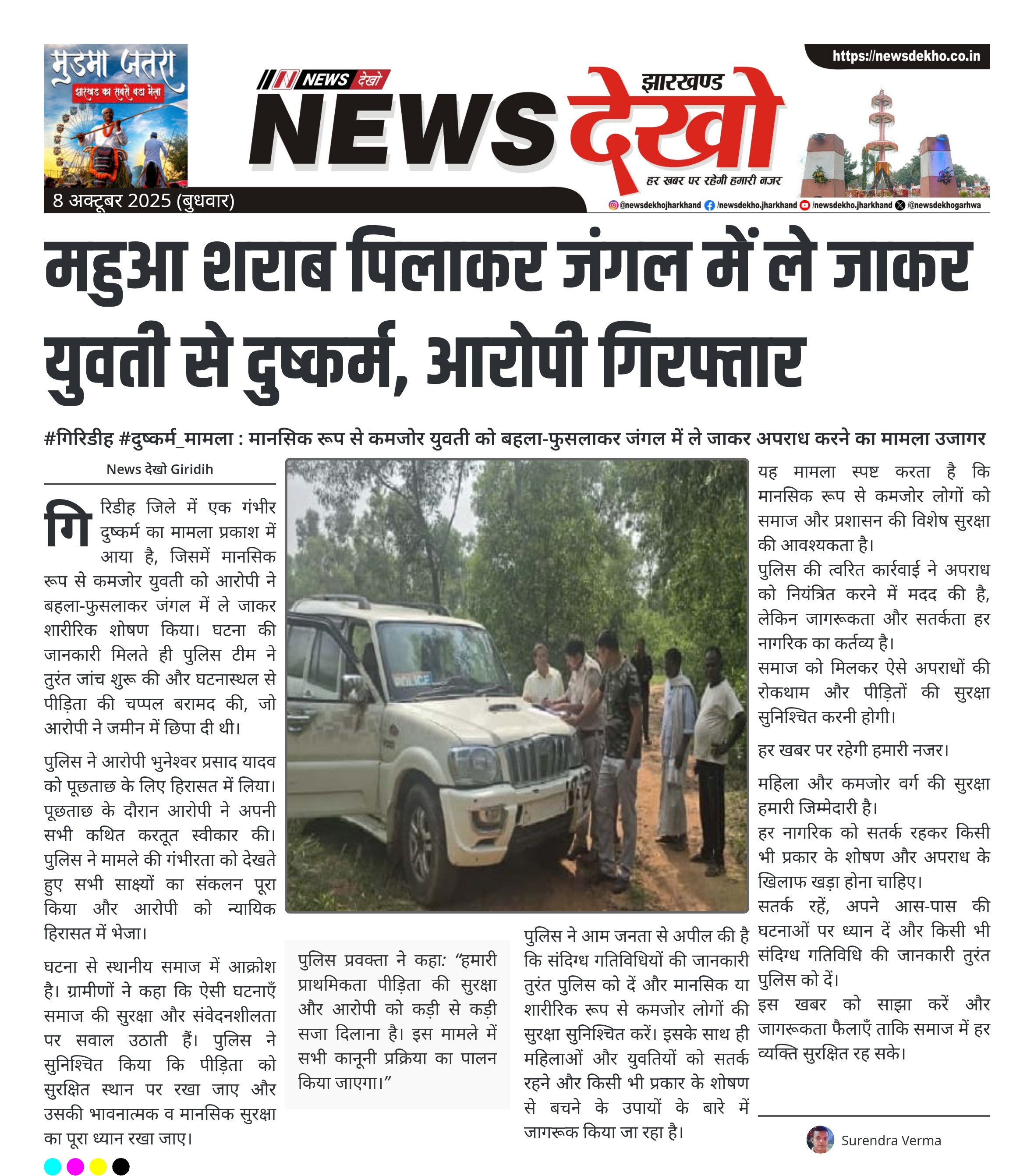 #गिरिडीह #दुष्कर्म_मामला : मानसिक रूप से कमजोर युवती को बहला-फुसलाकर जंगल में ले जाकर अपराध करने का मामला उजागर