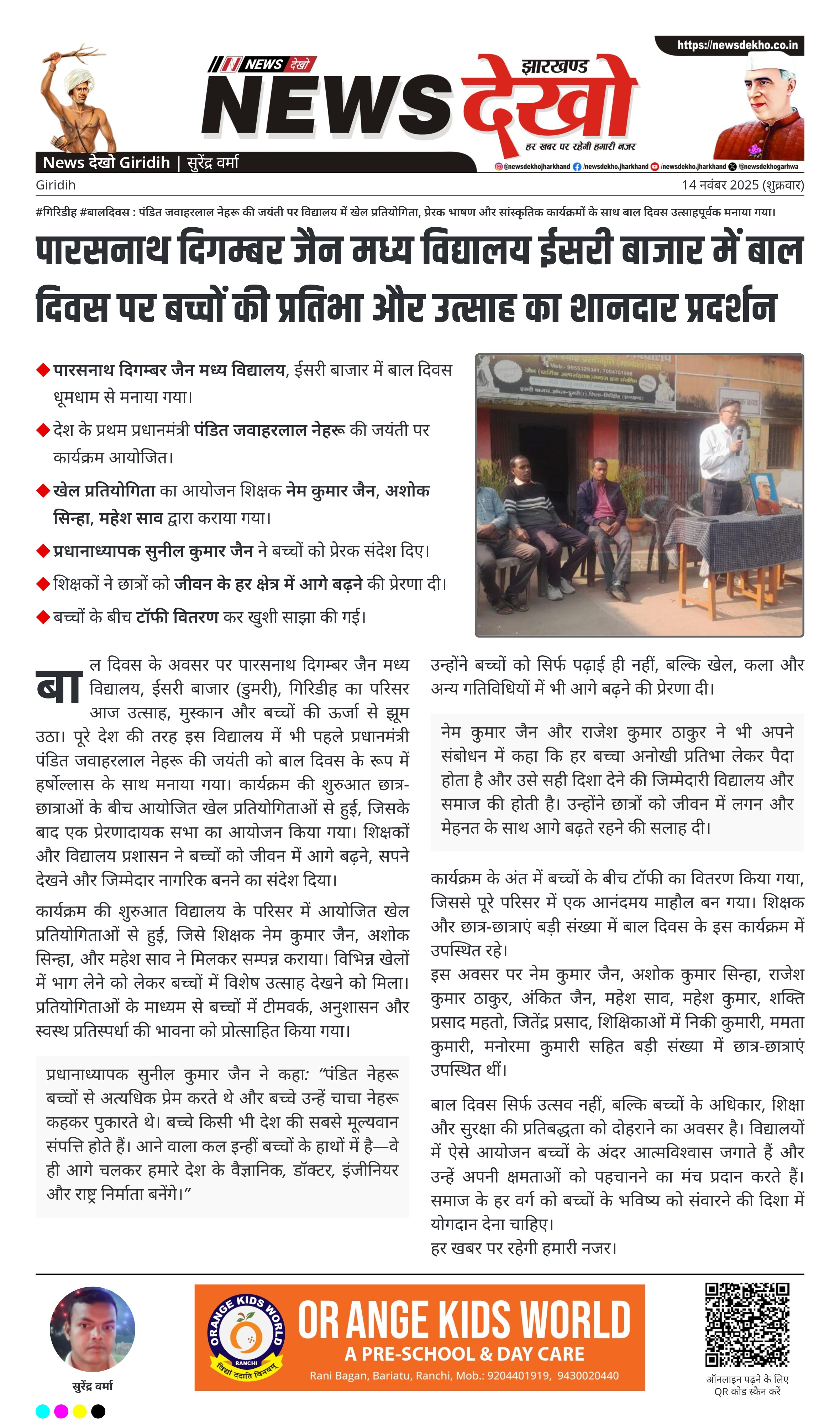 - पारसनाथ दिगम्बर जैन मध्य विद्यालय, ईसरी बाजार में बाल दिवस धूमधाम से मनाया गया।