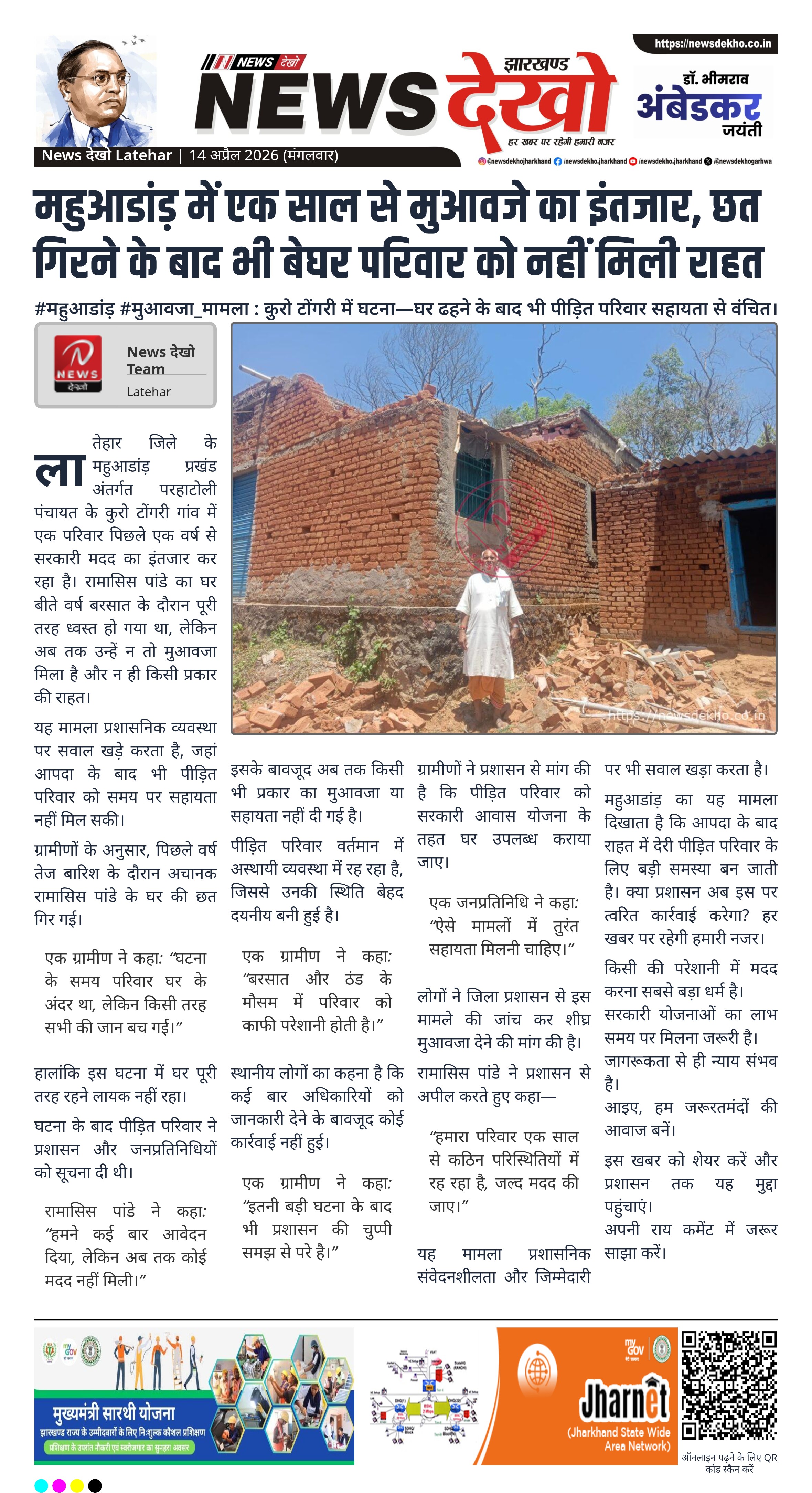 महुआडांड़ का यह मामला दिखाता है कि आपदा के बाद राहत में देरी पीड़ित परिवार के लिए बड़ी समस्या बन जाती है। क्या प्रशासन अब इस पर त्वरित कार्रवाई करेगा? हर खबर पर रहेगी हमारी नजर।