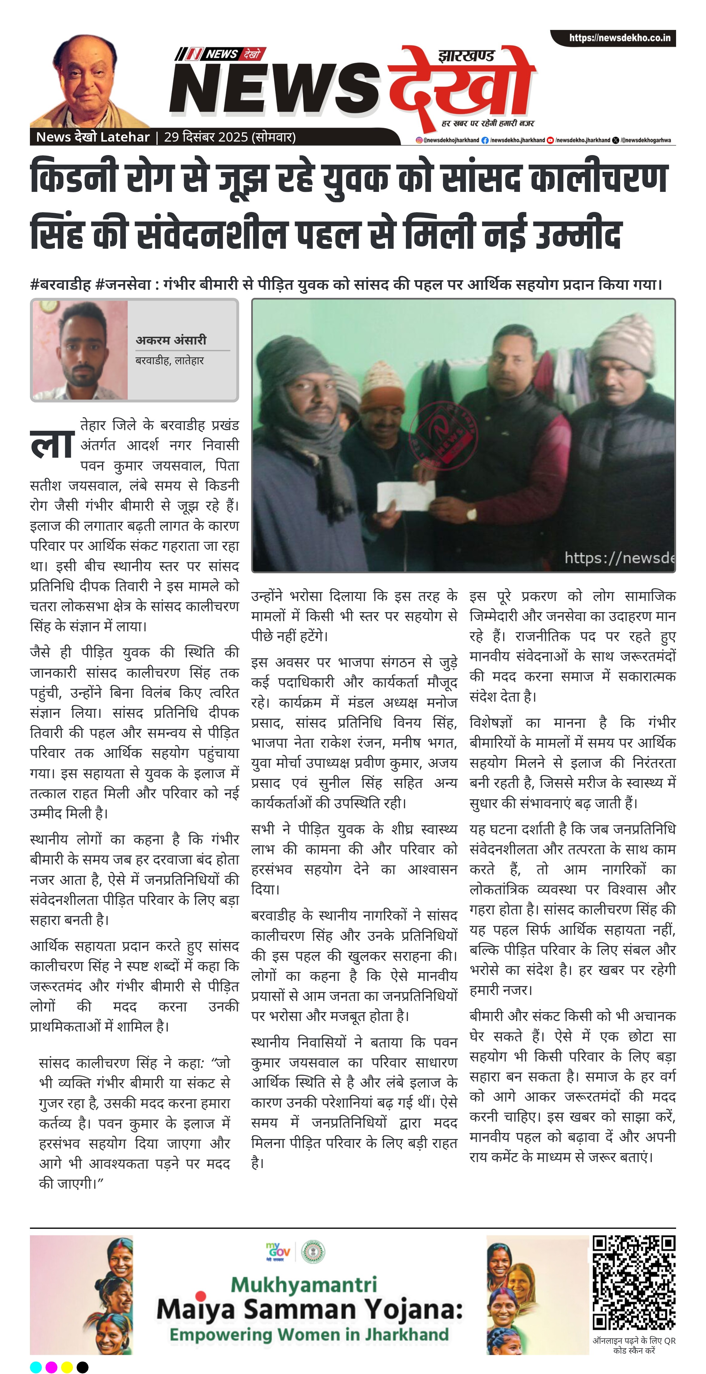लातेहार जिले के बरवाडीह प्रखंड में किडनी रोग से पीड़ित एक युवक को चतरा सांसद कालीचरण सिंह की पहल पर आर्थिक सहायता प्रदान की गई है। सांसद प्रतिनिधि दीपक तिवारी के माध्यम से मामला संज्ञान में आने के बाद तत्काल सहयोग किया गया। इस सहायता से पीड़ित परिवार को इलाज के लिए राहत मिली है। स्थानीय स्तर पर इस पहल को मानवीय संवेदना का उदाहरण माना जा रहा है।