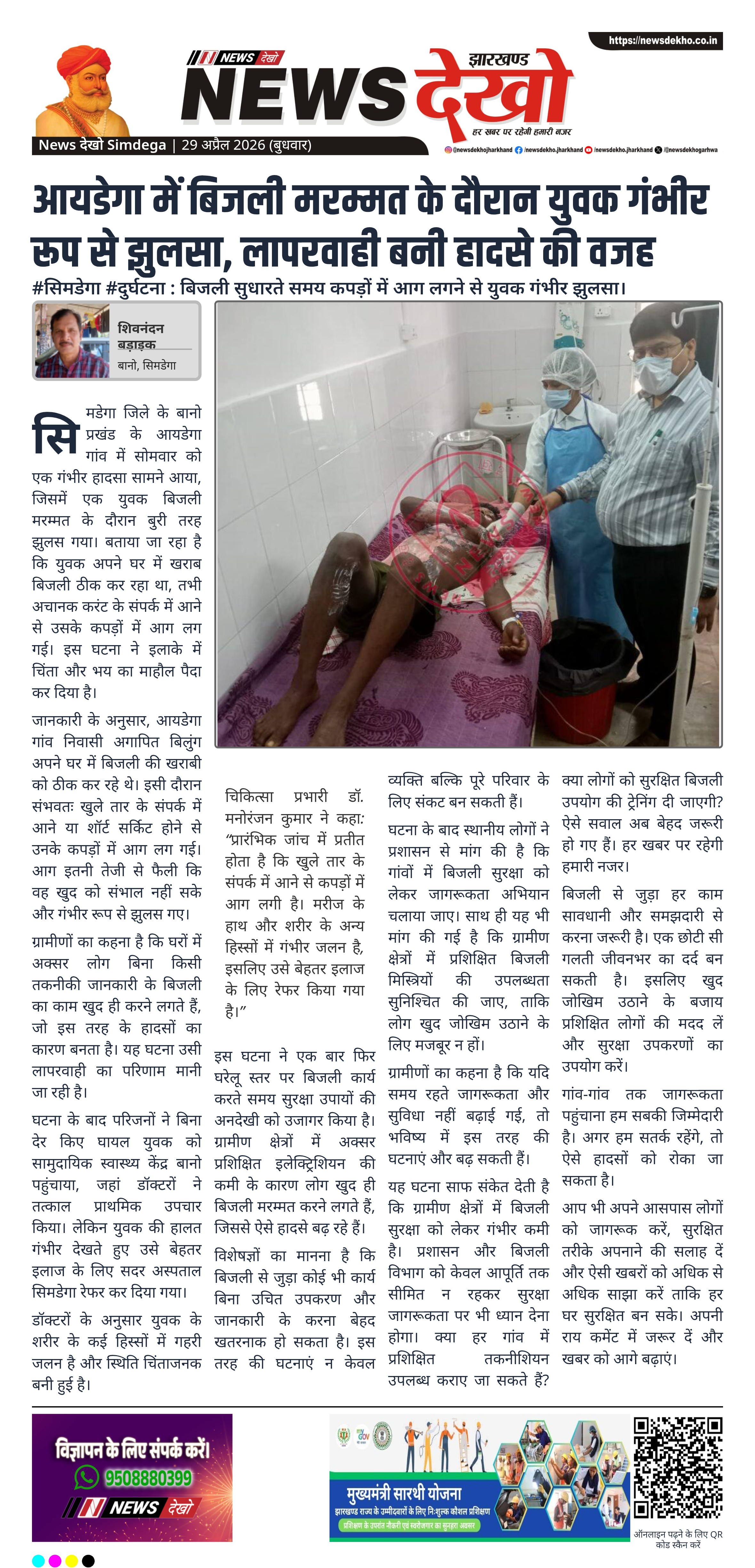 सिमडेगा जिले के बानो प्रखंड अंतर्गत आयडेगा गांव में बिजली मरम्मत के दौरान एक युवक गंभीर रूप से झुलस गया। घटना उस समय हुई जब वह अपने घर में खराब बिजली ठीक कर रहा था और अचानक कपड़ों में आग लग गई। घायल युवक को पहले सामुदायिक स्वास्थ्य केंद्र बानो ले जाया गया, जहां प्राथमिक उपचार के बाद उसे सदर अस्पताल सिमडेगा रेफर कर दिया गया। यह घटना घरेलू स्तर पर बिजली कार्य करते समय सुरक्षा की अनदेखी के खतरों को उजागर करती है।