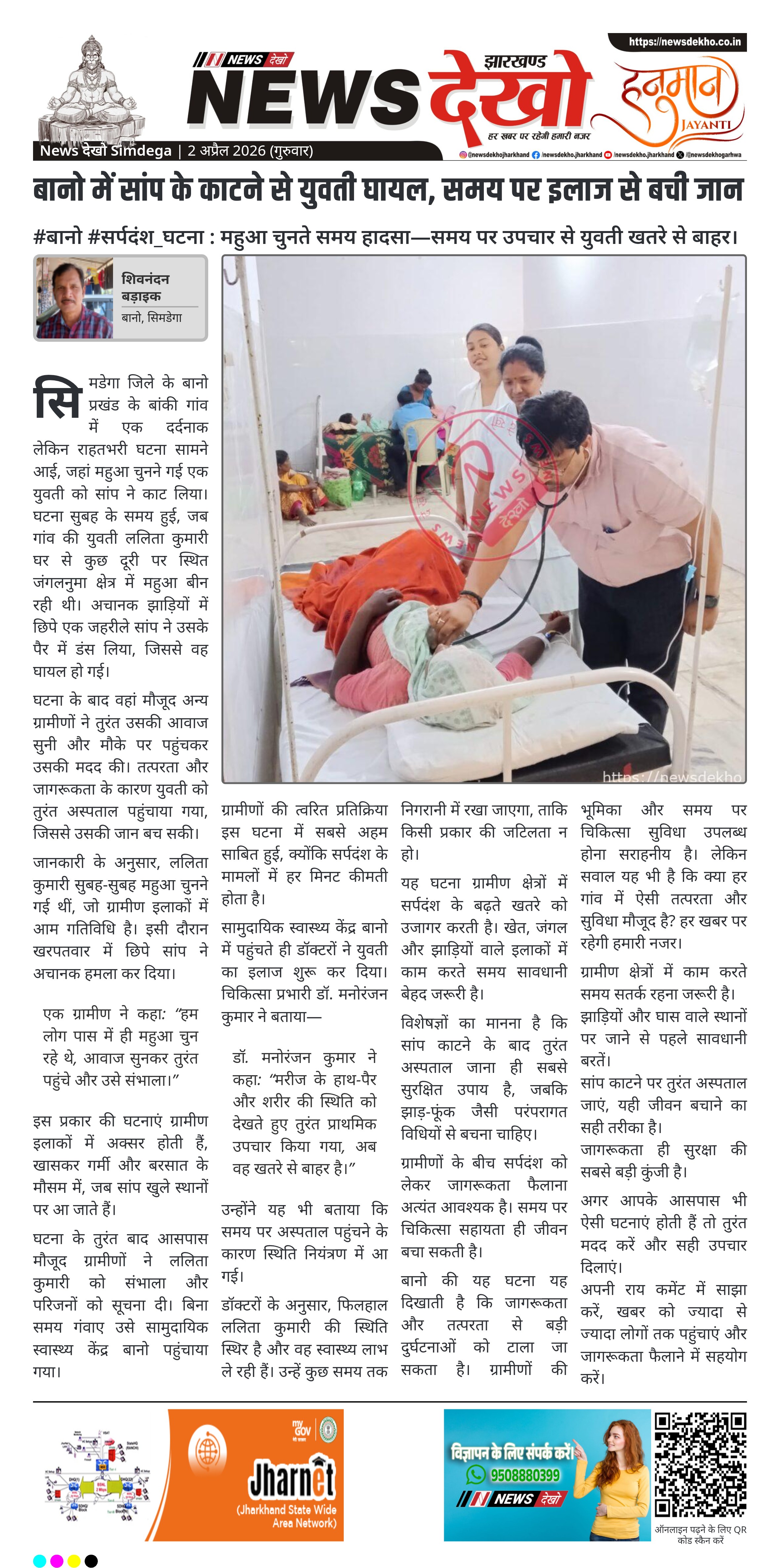 सिमडेगा जिले के बानो प्रखंड के बांकी गांव में एक दर्दनाक लेकिन राहतभरी घटना सामने आई, जहां महुआ चुनने गई एक युवती को सांप ने काट लिया। घटना सुबह के समय हुई, जब गांव की युवती ललिता कुमारी घर से कुछ दूरी पर स्थित जंगलनुमा क्षेत्र में महुआ बीन रही थी। अचानक झाड़ियों में छिपे एक जहरीले सांप ने उसके पैर में डंस लिया, जिससे वह घायल हो गई।