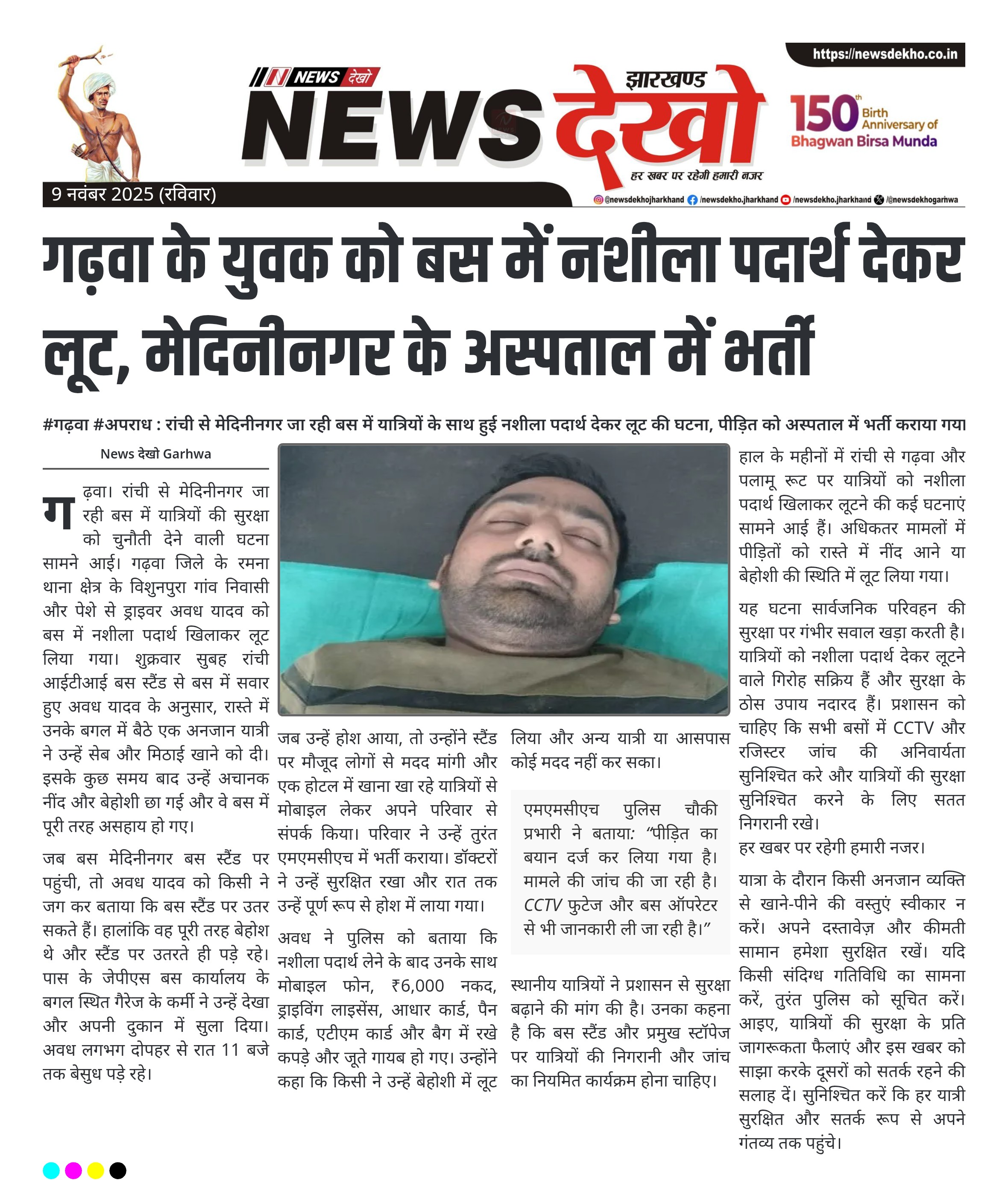 #गढ़वा #अपराध : रांची से मेदिनीनगर जा रही बस में यात्रियों के साथ हुई नशीला पदार्थ देकर लूट की घटना, पीड़ित को अस्पताल में भर्ती कराया गया