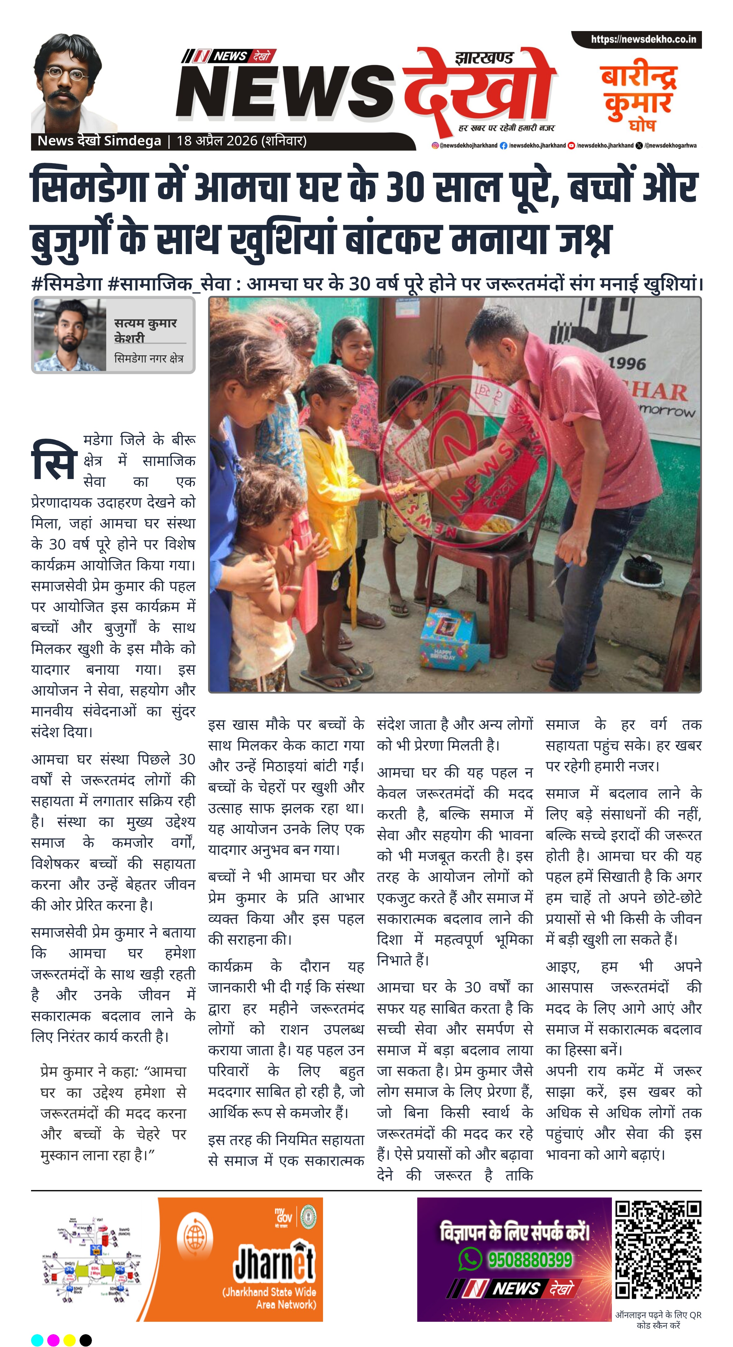 सिमडेगा जिले के बीरू क्षेत्र में आमचा घर संस्था के 30 वर्ष पूरे होने पर विशेष कार्यक्रम आयोजित किया गया। समाजसेवी प्रेम कुमार की पहल पर बच्चों और बुजुर्गों के साथ यह जश्न मनाया गया। कार्यक्रम में केक काटकर खुशी साझा की गई और जरूरतमंदों को सहयोग दिया गया। यह आयोजन सेवा और समर्पण की भावना को दर्शाता है।