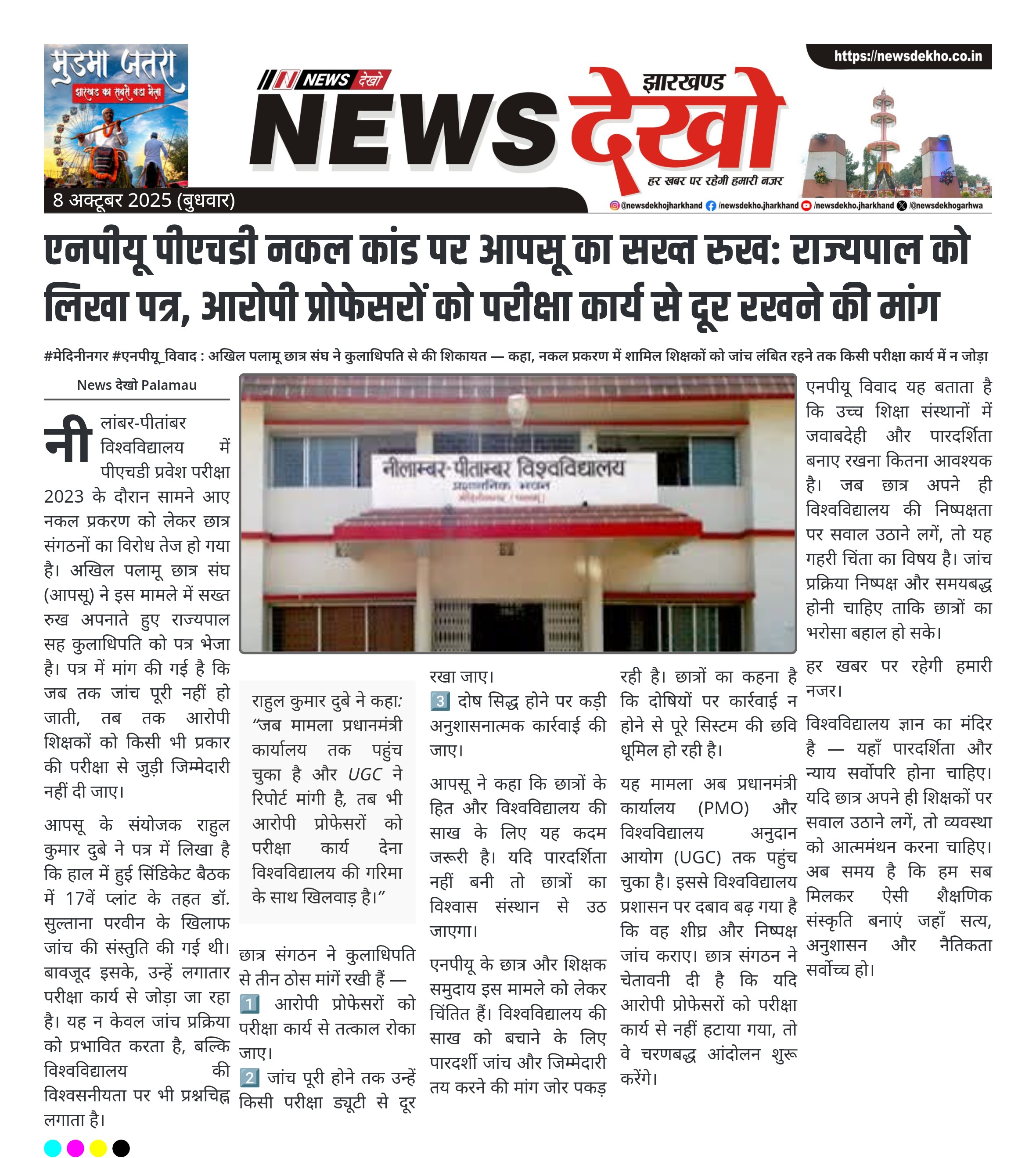 #मेदिनीनगर #एनपीयू_विवाद : अखिल पलामू छात्र संघ ने कुलाधिपति से की शिकायत — कहा, नकल प्रकरण में शामिल शिक्षकों को जांच लंबित रहने तक किसी परीक्षा कार्य में न जोड़ा जाए