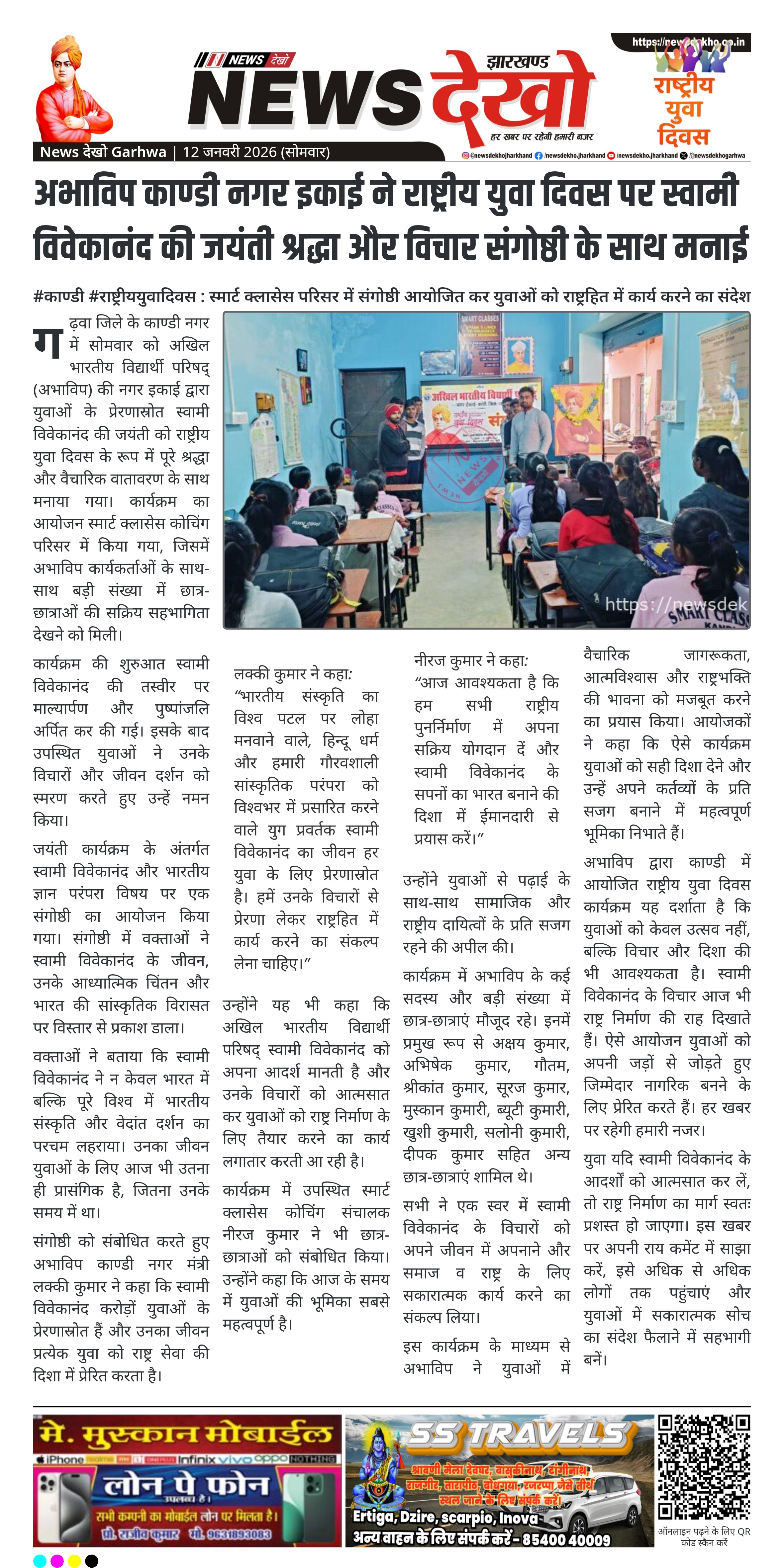 गढ़वा जिले के काण्डी नगर में अखिल भारतीय विद्यार्थी परिषद् की नगर इकाई द्वारा स्वामी विवेकानंद की जयंती को राष्ट्रीय युवा दिवस के रूप में मनाया गया। कार्यक्रम का आयोजन स्मार्ट क्लासेस कोचिंग परिसर में किया गया, जिसमें बड़ी संख्या में छात्र-छात्राओं और अभाविप कार्यकर्ताओं ने भाग लिया। इस अवसर पर स्वामी विवेकानंद के जीवन, विचारों और भारतीय ज्ञान परंपरा पर संगोष्ठी आयोजित की गई। कार्यक्रम का उद्देश्य युवाओं को राष्ट्र निर्माण के लिए प्रेरित करना और उनके आदर्शों से जोड़ना रहा।