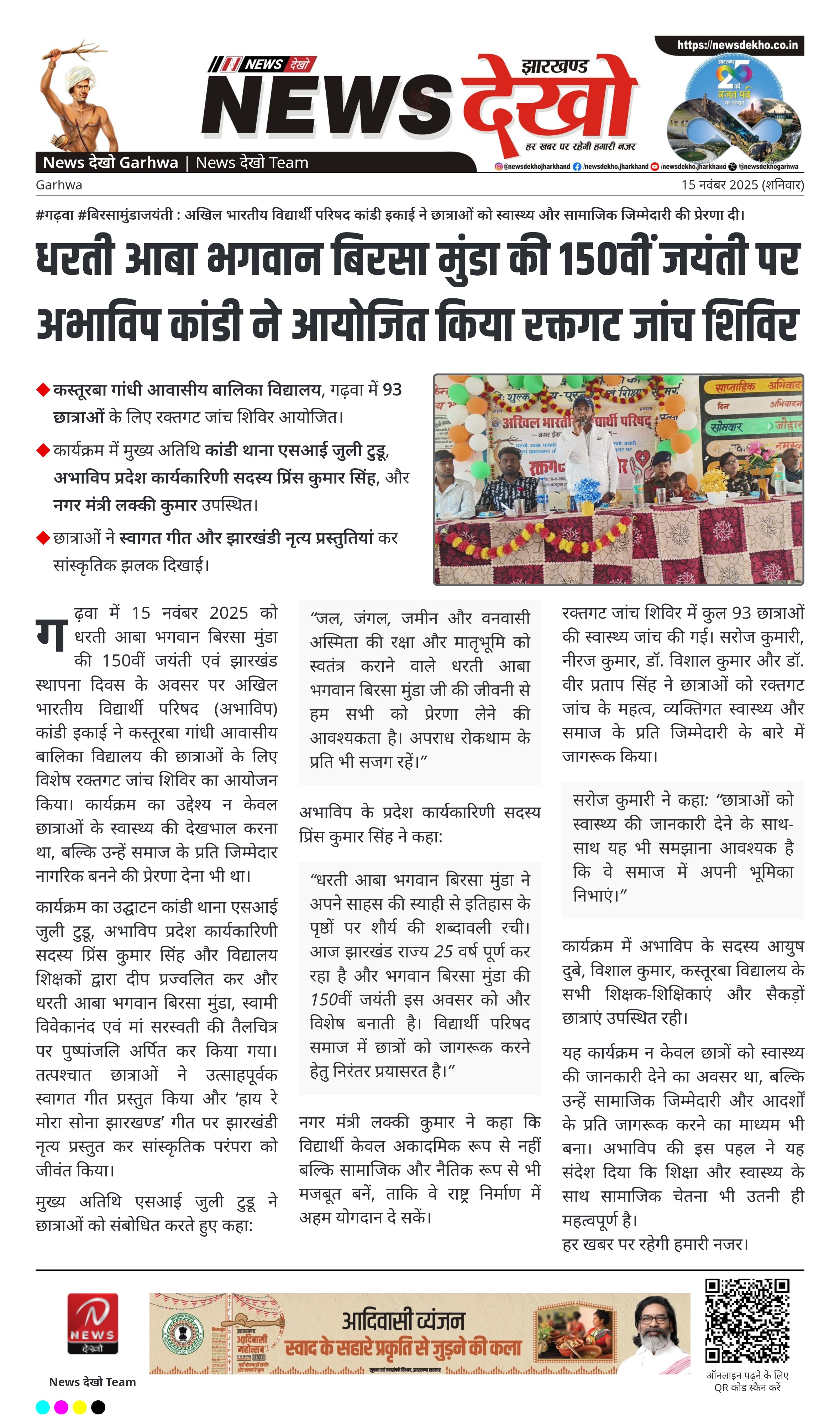 गढ़वा में 15 नवंबर 2025 को धरती आबा भगवान बिरसा मुंडा की 150वीं जयंती एवं झारखंड स्थापना दिवस के अवसर पर अखिल भारतीय विद्यार्थी परिषद (अभाविप) कांडी इकाई ने कस्तूरबा गांधी आवासीय बालिका विद्यालय की छात्राओं के लिए विशेष रक्तगट जांच शिविर का आयोजन किया। कार्यक्रम का उद्देश्य न केवल छात्राओं के स्वास्थ्य की देखभाल करना था, बल्कि उन्हें समाज के प्रति जिम्मेदार नागरिक बनने की प्रेरणा देना भी था।