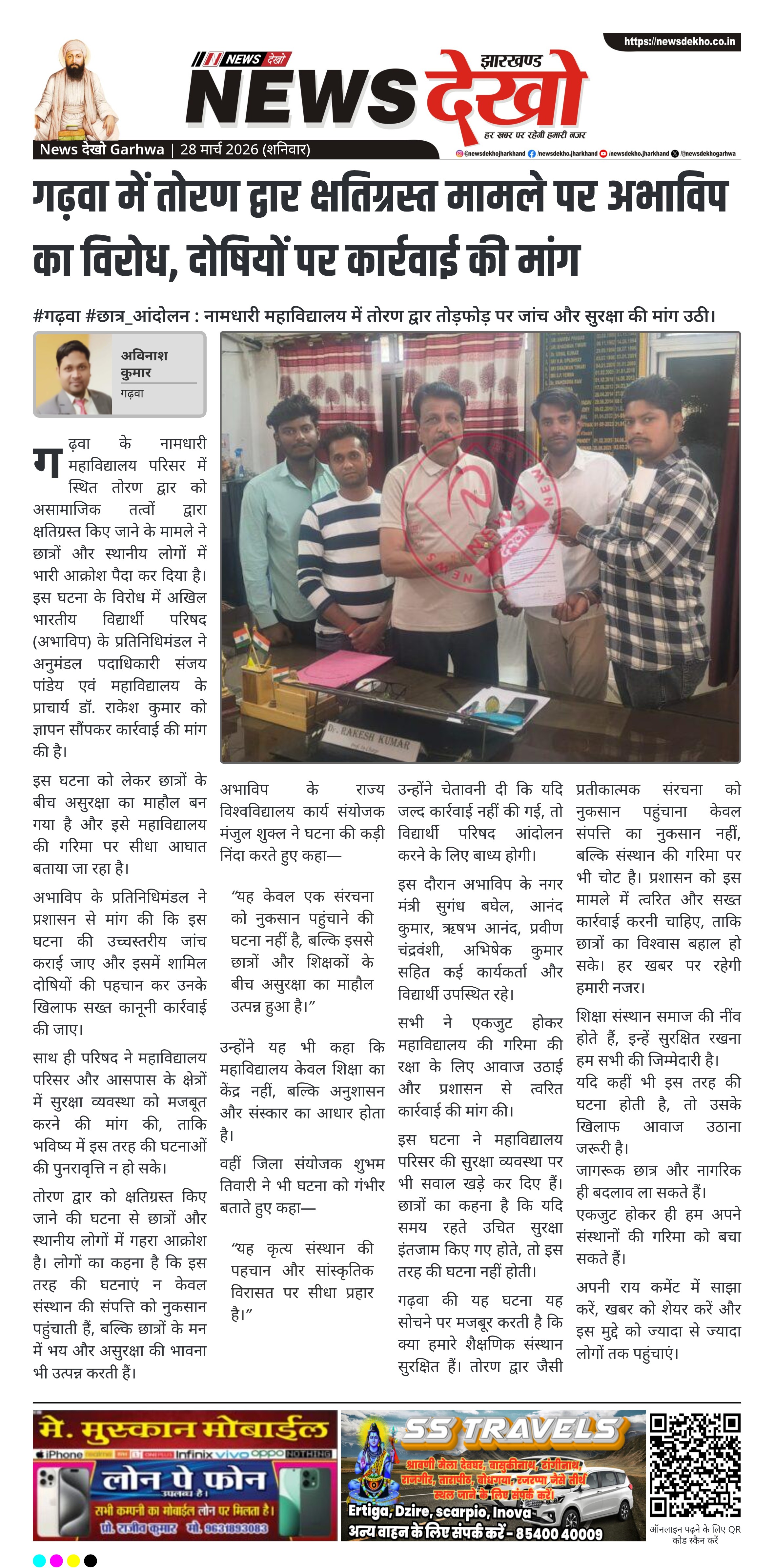 गढ़वा के नामधारी महाविद्यालय परिसर में स्थित तोरण द्वार को असामाजिक तत्वों द्वारा क्षतिग्रस्त किए जाने के मामले ने छात्रों और स्थानीय लोगों में भारी आक्रोश पैदा कर दिया है। इस घटना के विरोध में अखिल भारतीय विद्यार्थी परिषद (अभाविप) के प्रतिनिधिमंडल ने अनुमंडल पदाधिकारी संजय पांडेय एवं महाविद्यालय के प्राचार्य डॉ. राकेश कुमार को ज्ञापन सौंपकर कार्रवाई की मांग की है।