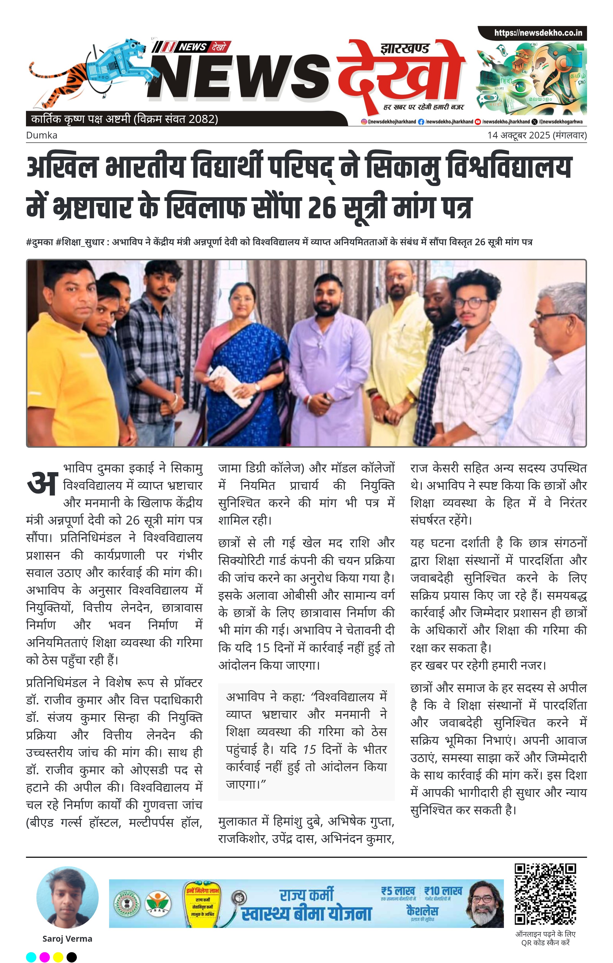 अभाविप दुमका इकाई ने सिकामु विश्वविद्यालय में व्याप्त भ्रष्टाचार और मनमानी के खिलाफ केंद्रीय मंत्री अन्नपूर्णा देवी को 26 सूत्री मांग पत्र सौंपा। प्रतिनिधिमंडल ने विश्वविद्यालय प्रशासन की कार्यप्रणाली पर गंभीर सवाल उठाए और कार्रवाई की मांग की। अभाविप के अनुसार विश्वविद्यालय में नियुक्तियों, वित्तीय लेनदेन, छात्रावास निर्माण और भवन निर्माण में अनियमितताएं शिक्षा व्यवस्था की गरिमा को ठेस पहुँचा रही हैं।
