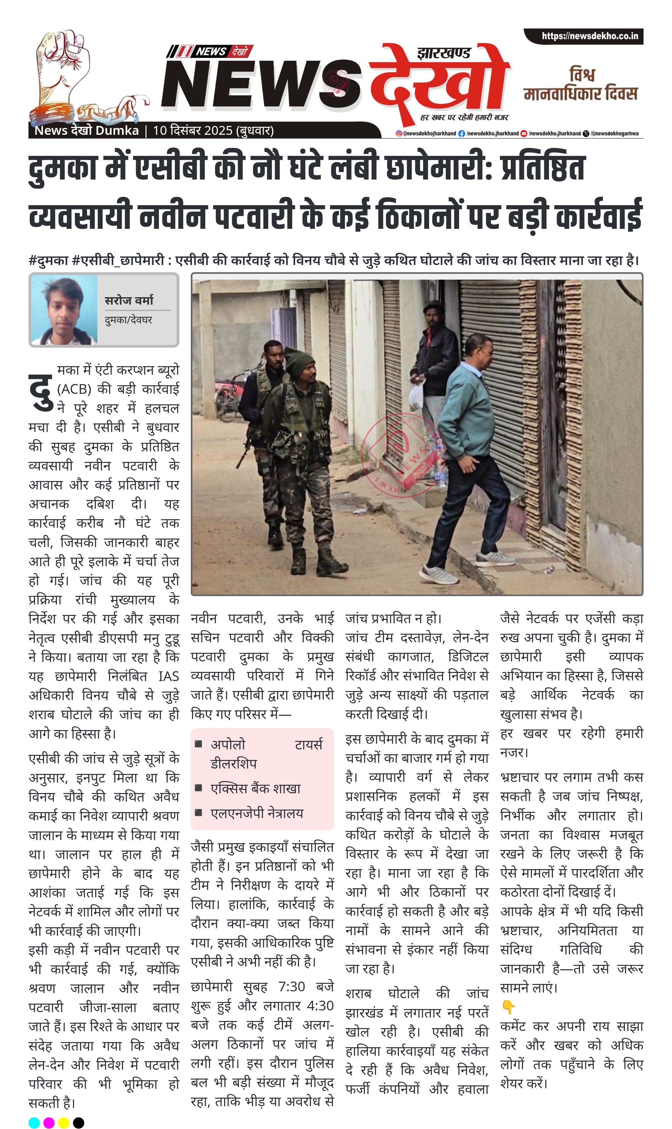 दुमका में एसीबी की नौ घंटे लंबी छापेमारी: प्रतिष्ठित व्यवसायी नवीन पटवारी के कई ठिकानों पर बड़ी कार्रवाई