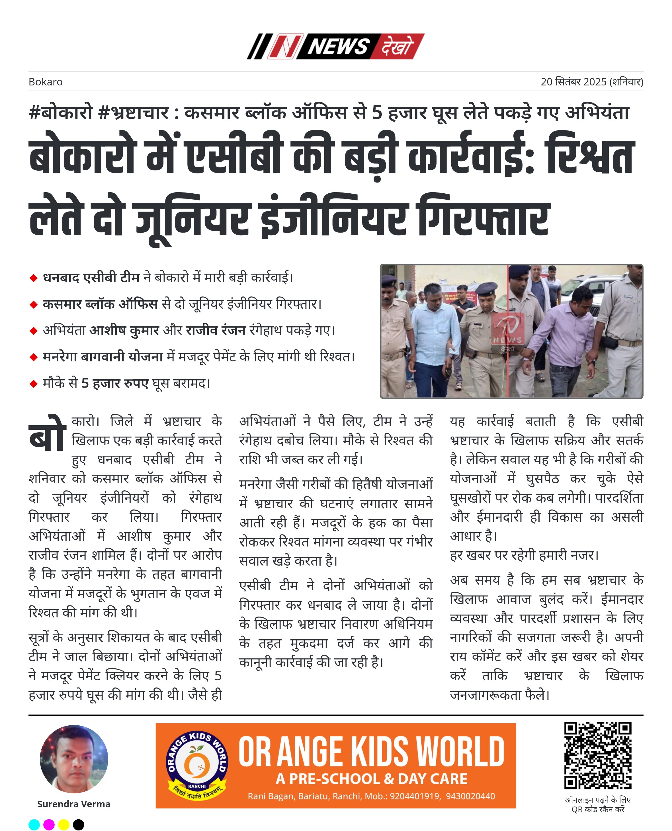 • कसमार ब्लॉक ऑफिस से दो जूनियर इंजीनियर गिरफ्तार।
