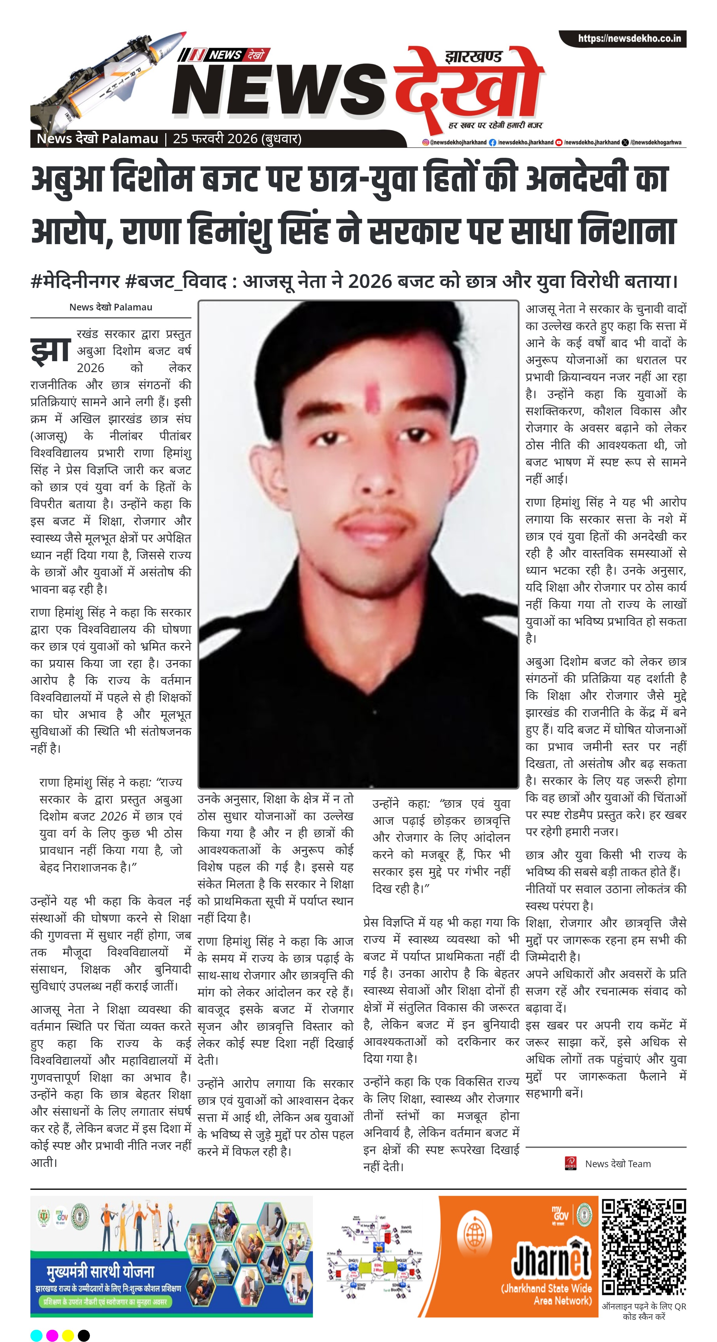 राणा हिमांशु सिंह ने कहा: “राज्य सरकार के द्वारा प्रस्तुत अबुआ दिशोम बजट 2026 में छात्र एवं युवा वर्ग के लिए कुछ भी ठोस प्रावधान नहीं किया गया है, जो बेहद निराशाजनक है।”