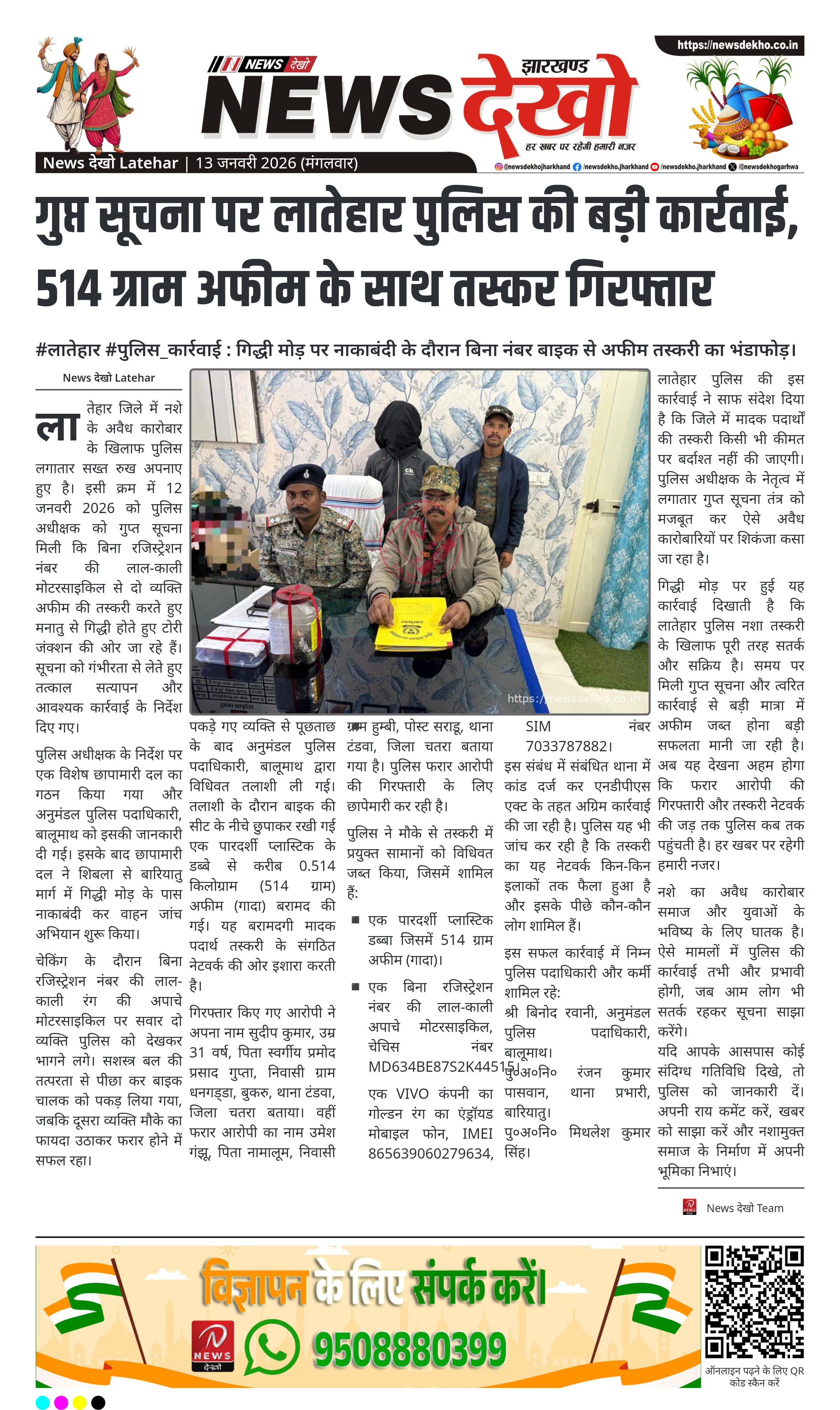 लातेहार जिले में नशे के अवैध कारोबार के खिलाफ पुलिस लगातार सख्त रुख अपनाए हुए है। इसी क्रम में 12 जनवरी 2026 को पुलिस अधीक्षक को गुप्त सूचना मिली कि बिना रजिस्ट्रेशन नंबर की लाल-काली मोटरसाइकिल से दो व्यक्ति अफीम की तस्करी करते हुए मनातु से गिद्धी होते हुए टोरी जंक्शन की ओर जा रहे हैं। सूचना को गंभीरता से लेते हुए तत्काल सत्यापन और आवश्यक कार्रवाई के निर्देश दिए गए।
