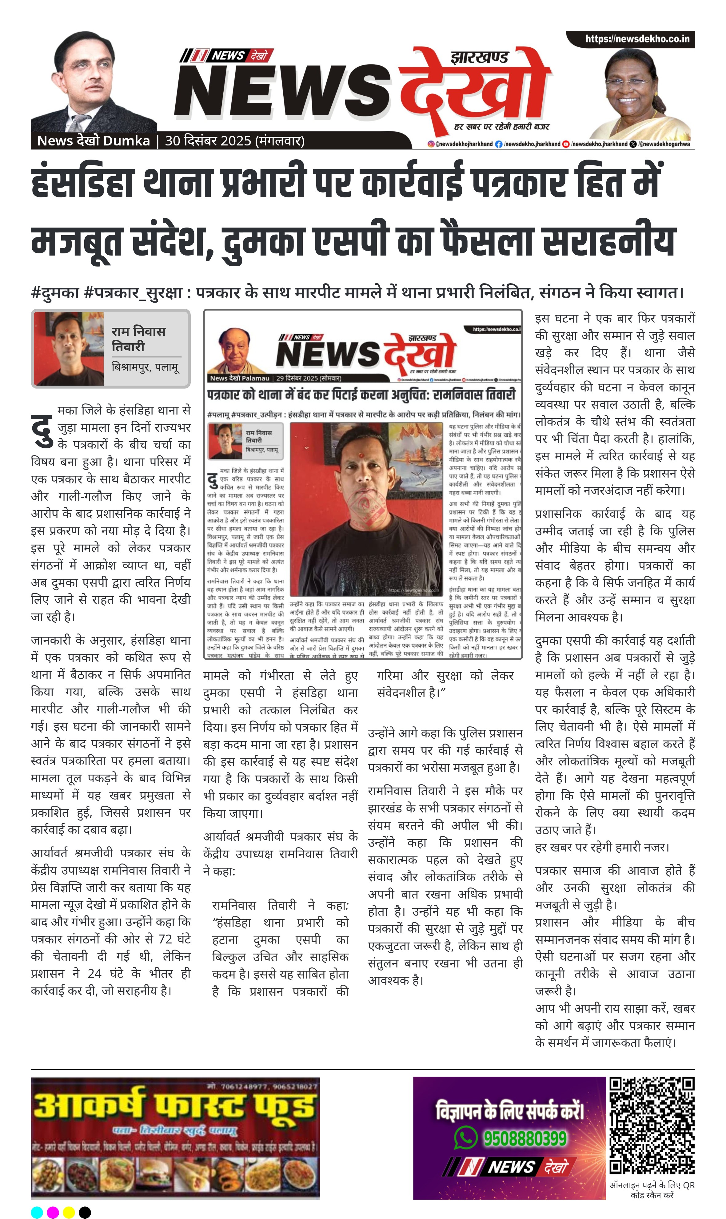 रामनिवास तिवारी ने कहा: “हंसडिहा थाना प्रभारी को हटाना दुमका एसपी का बिल्कुल उचित और साहसिक कदम है। इससे यह साबित होता है कि प्रशासन पत्रकारों की गरिमा और सुरक्षा को लेकर संवेदनशील है।”