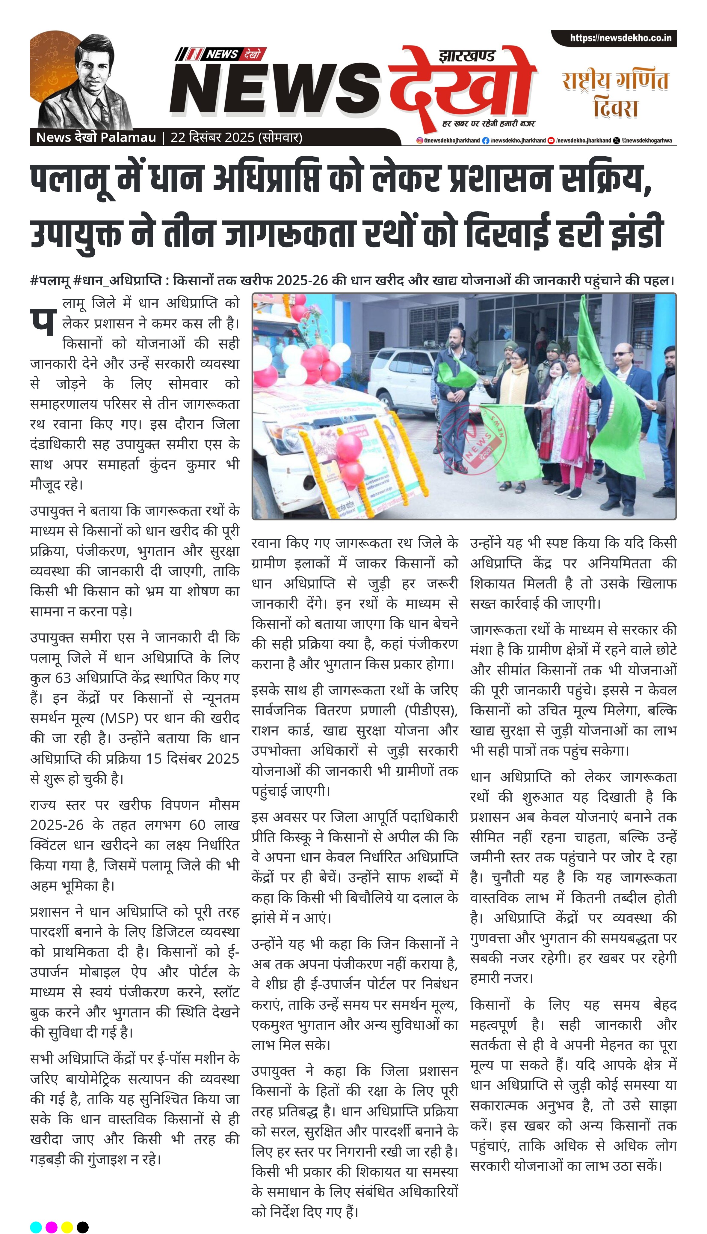 पलामू जिले में धान अधिप्राप्ति अभियान को सफल बनाने के उद्देश्य से प्रशासन ने किसानों को जागरूक करने की दिशा में बड़ा कदम उठाया है। सोमवार को समाहरणालय परिसर से उपायुक्त समीरा एस ने तीन जागरूकता रथों को हरी झंडी दिखाकर रवाना किया। ये रथ खरीफ विपणन मौसम 2025-26 के तहत चल रही धान खरीद प्रक्रिया, पंजीकरण और भुगतान व्यवस्था की जानकारी गांव-गांव पहुंचाएंगे। इस पहल का उद्देश्य किसानों को बिचौलियों से बचाना और उन्हें न्यूनतम समर्थन मूल्य का सीधा लाभ दिलाना है।