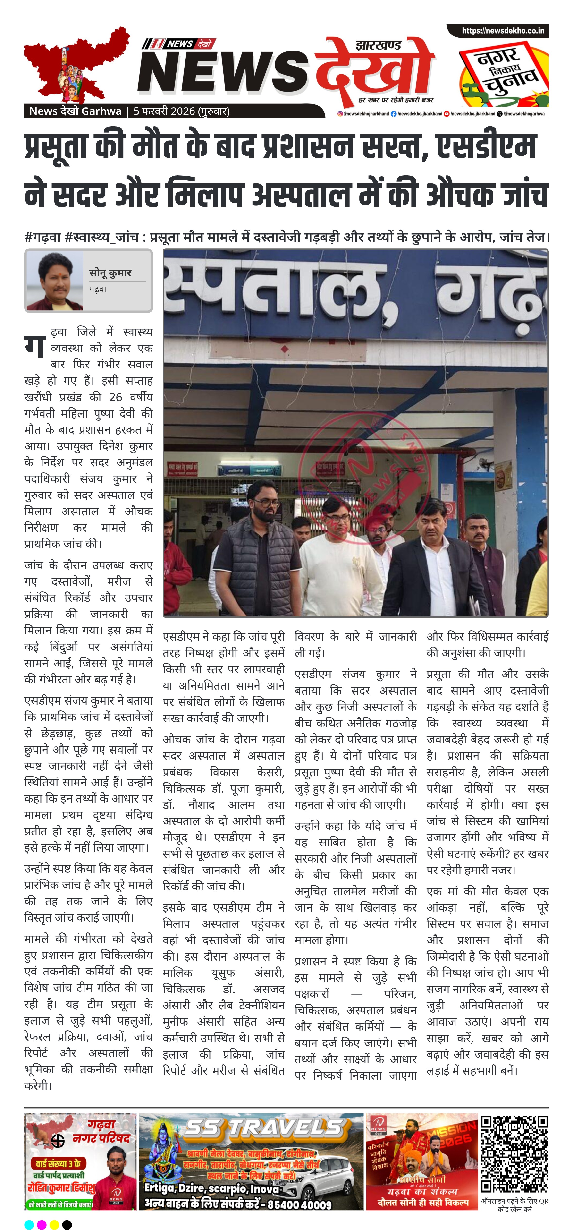 गढ़वा जिले में एक प्रसूता की मौत के मामले ने प्रशासन को गंभीर कदम उठाने पर मजबूर कर दिया है। इसी क्रम में गुरुवार को सदर एसडीएम संजय कुमार ने सदर अस्पताल और निजी मिलाप अस्पताल में औचक जांच की। प्रारंभिक जांच में दस्तावेजों से छेड़छाड़ और तथ्यों को छुपाने के संकेत मिलने से मामला प्रथम दृष्टया संदिग्ध पाया गया। अब पूरे प्रकरण की गहन और निष्पक्ष जांच की प्रक्रिया शुरू की जा रही है।