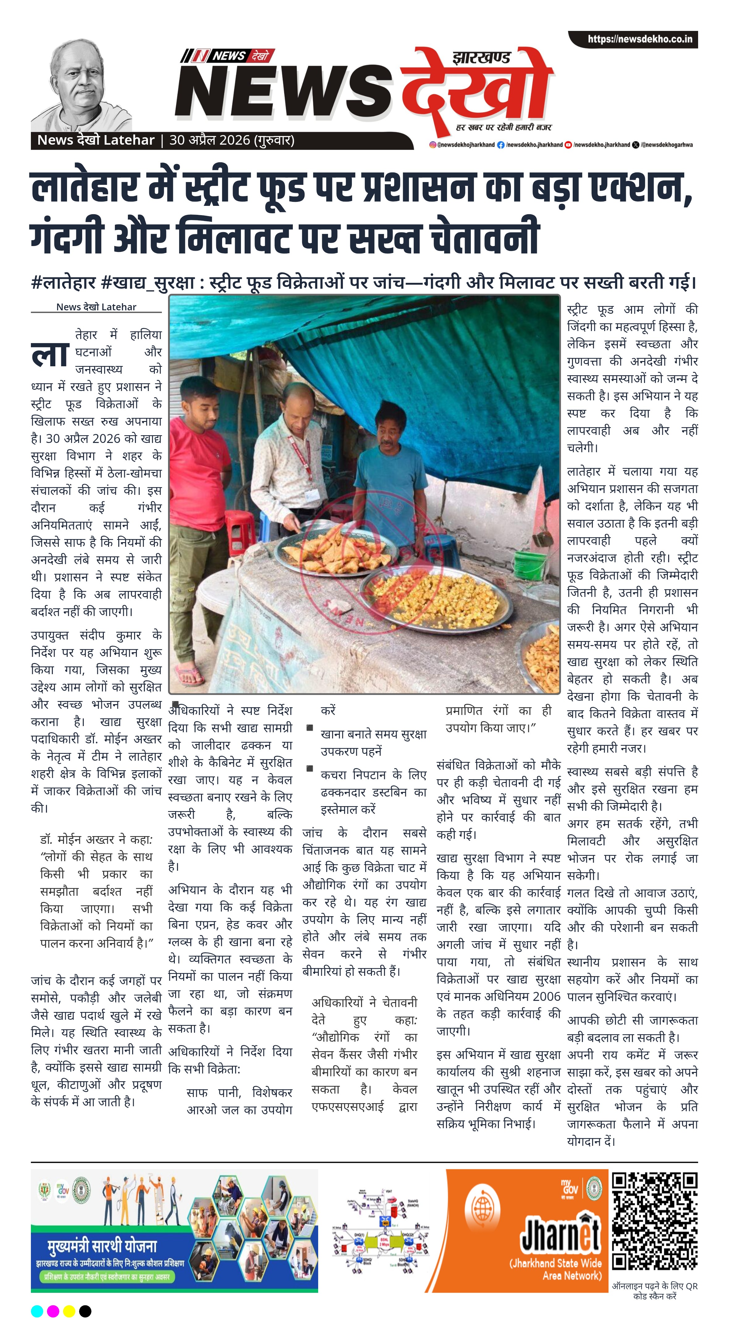 लातेहार जिले में आम लोगों के स्वास्थ्य को ध्यान में रखते हुए 30 अप्रैल 2026 को खाद्य सुरक्षा विभाग ने स्ट्रीट फूड विक्रेताओं के खिलाफ सघन जांच अभियान चलाया। उपायुक्त संदीप कुमार के निर्देश पर यह कार्रवाई की गई, जिसमें कई स्थानों पर गंदगी, खुले खाद्य पदार्थ और मिलावटी सामग्री पाई गई। अधिकारियों ने नियमों के पालन के लिए सख्त चेतावनी जारी की है। यह अभियान जनस्वास्थ्य सुरक्षा के लिहाज से बेहद महत्वपूर्ण माना जा रहा है।