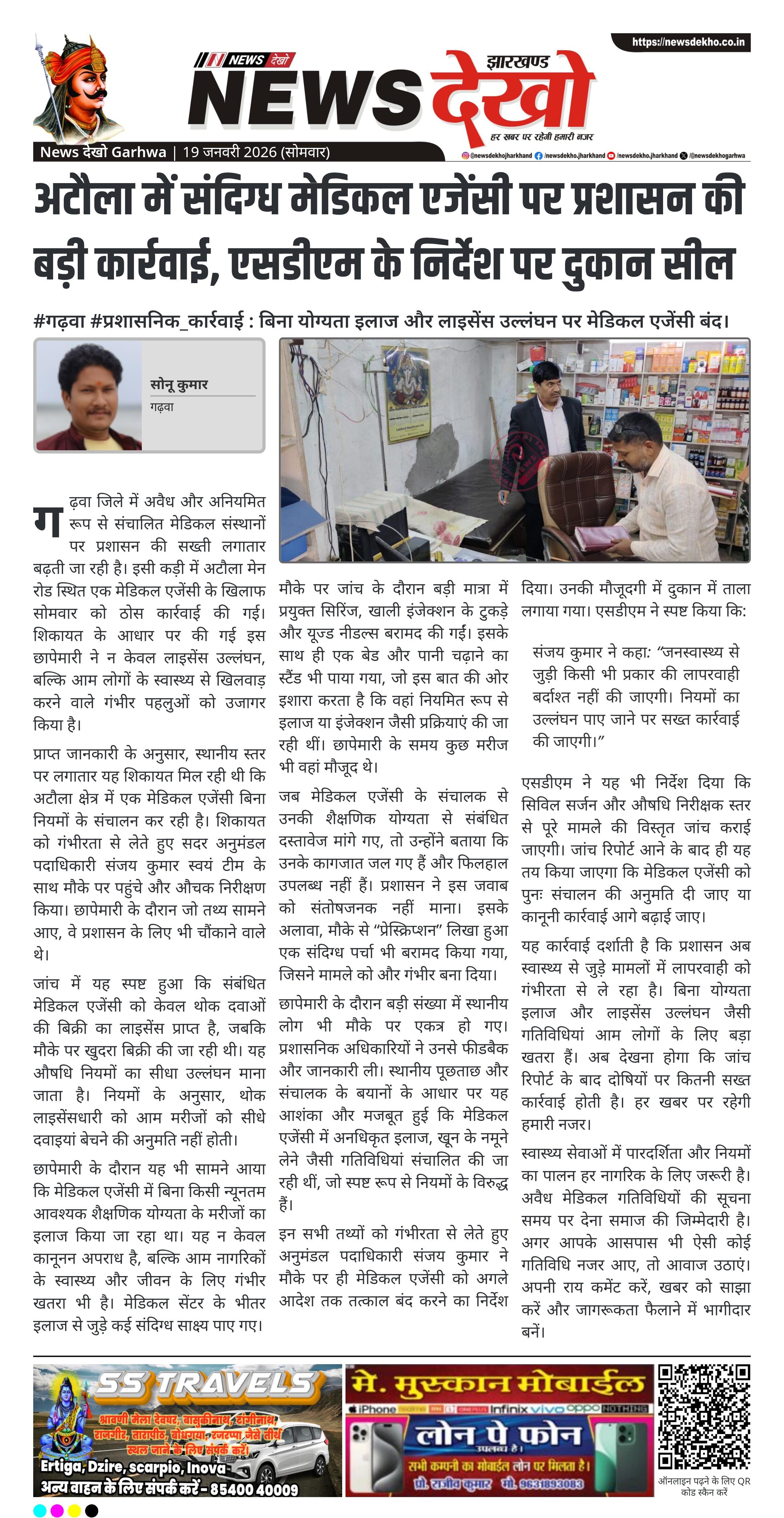 गढ़वा सदर अनुमंडल के अटौला मेन रोड पर संचालित एक मेडिकल एजेंसी पर प्रशासन ने कड़ी कार्रवाई की है। शिकायत मिलने के बाद सदर अनुमंडल पदाधिकारी संजय कुमार ने सोमवार को औचक छापेमारी कर कई गंभीर अनियमितताएं पाईं। जांच में लाइसेंस शर्तों के उल्लंघन, अनधिकृत इलाज और अस्वच्छ चिकित्सकीय गतिविधियों के साक्ष्य मिले। जनहित को देखते हुए एजेंसी को अगले आदेश तक तत्काल बंद कर दिया गया है।
