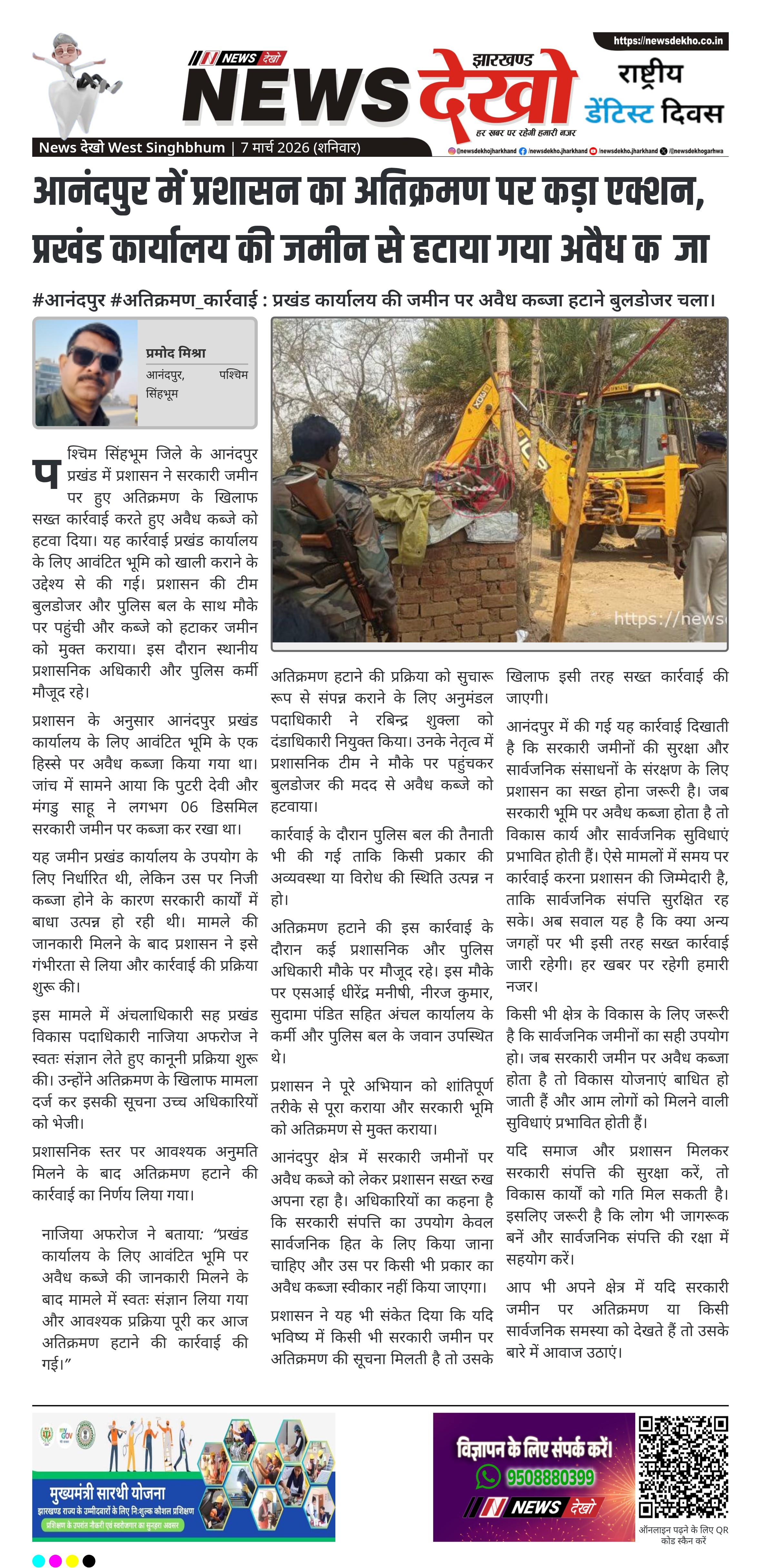 पश्चिम सिंहभूम जिले के आनंदपुर प्रखंड में प्रशासन ने प्रखंड कार्यालय के लिए आवंटित जमीन से अवैध अतिक्रमण हटाने की कार्रवाई की। अंचलाधिकारी सह प्रखंड विकास पदाधिकारी नाजिया अफरोज के निर्देश पर बुलडोजर चलाकर कब्जा खाली कराया गया। बताया गया कि पुटरी देवी और मंगडु साहू द्वारा छह डिसमिल सरकारी भूमि पर अवैध कब्जा किया गया था। अनुमंडल पदाधिकारी के आदेश पर दंडाधिकारी की मौजूदगी में पुलिस बल के साथ यह कार्रवाई पूरी की गई।