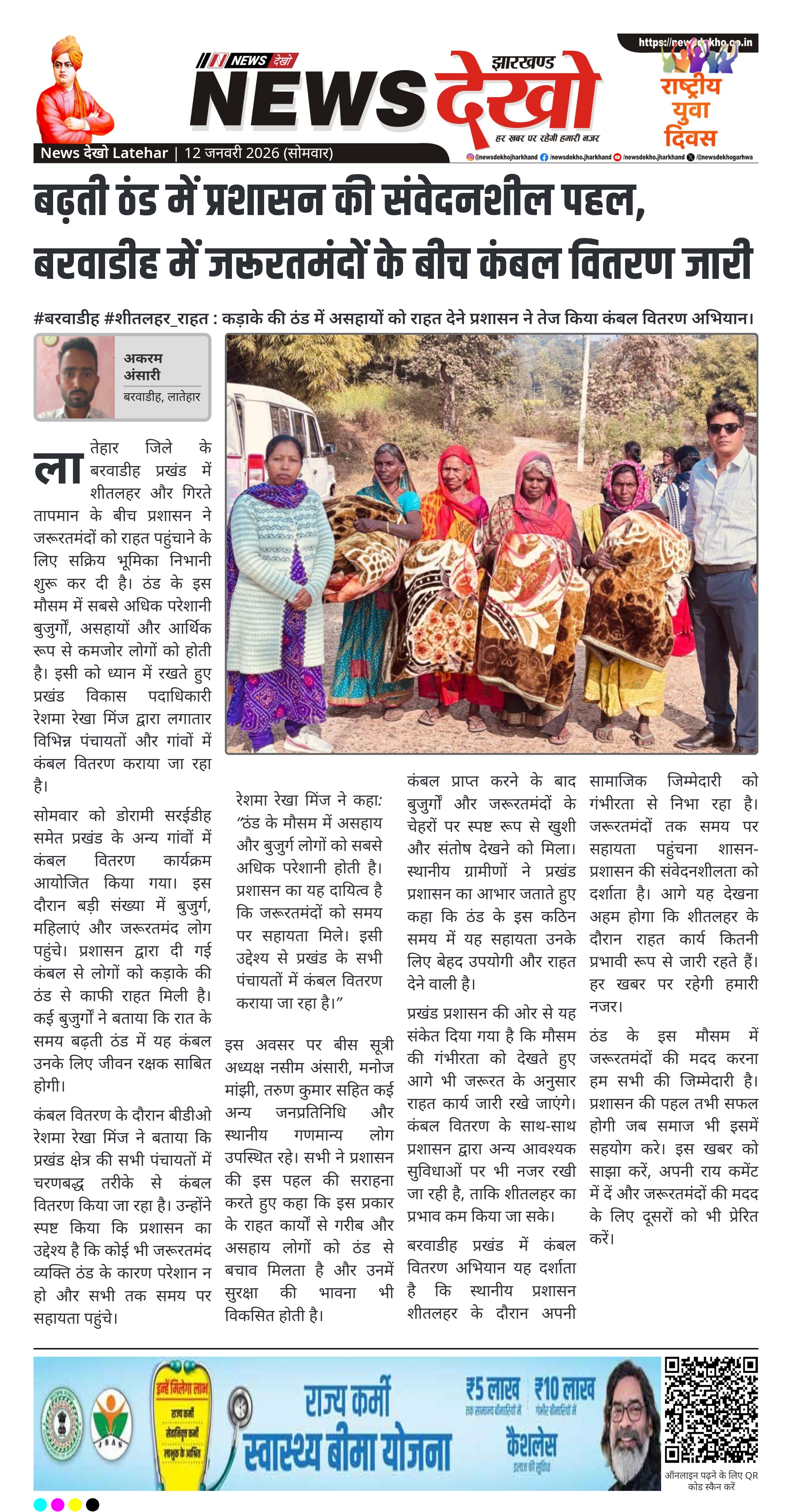 लातेहार जिले के बरवाडीह प्रखंड में शीतलहर और गिरते तापमान के बीच प्रशासन ने जरूरतमंदों को राहत पहुंचाने के लिए सक्रिय भूमिका निभानी शुरू कर दी है। ठंड के इस मौसम में सबसे अधिक परेशानी बुजुर्गों, असहायों और आर्थिक रूप से कमजोर लोगों को होती है। इसी को ध्यान में रखते हुए प्रखंड विकास पदाधिकारी रेशमा रेखा मिंज द्वारा लगातार विभिन्न पंचायतों और गांवों में कंबल वितरण कराया जा रहा है।