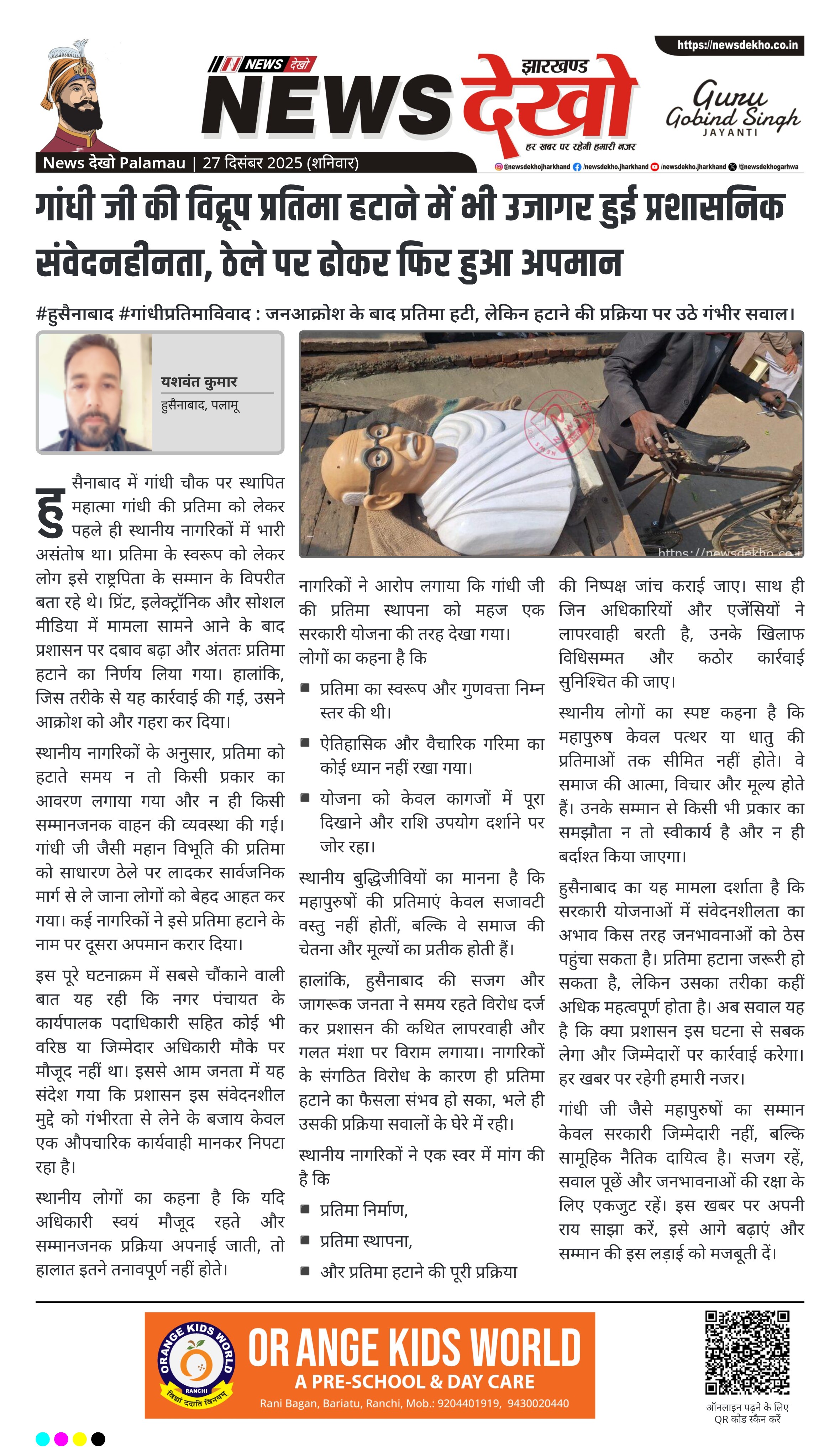 • हुसैनाबाद गांधी चौक से महात्मा गांधी की विद्रूप प्रतिमा हटाई गई।
