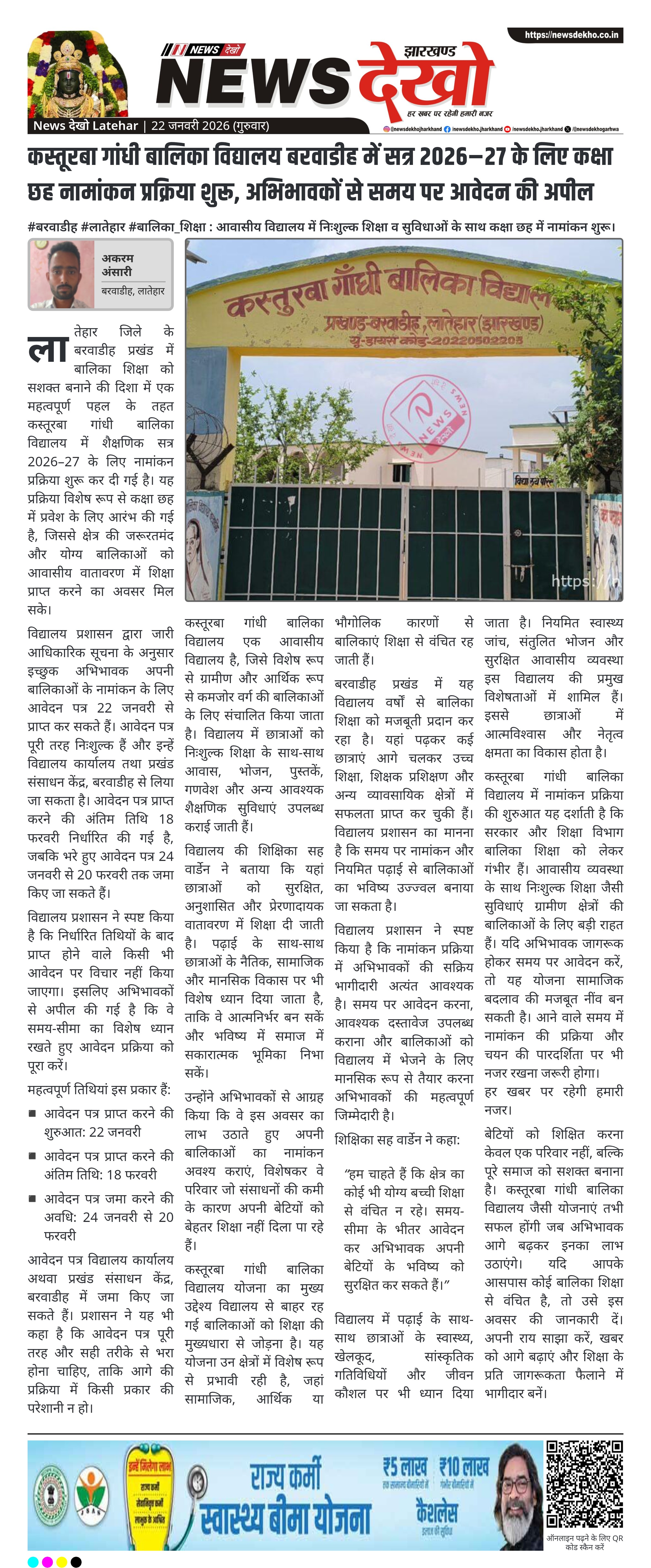 - कस्तूरबा गांधी बालिका विद्यालय, बरवाडीह में सत्र 2026–27 हेतु नामांकन प्रारंभ।