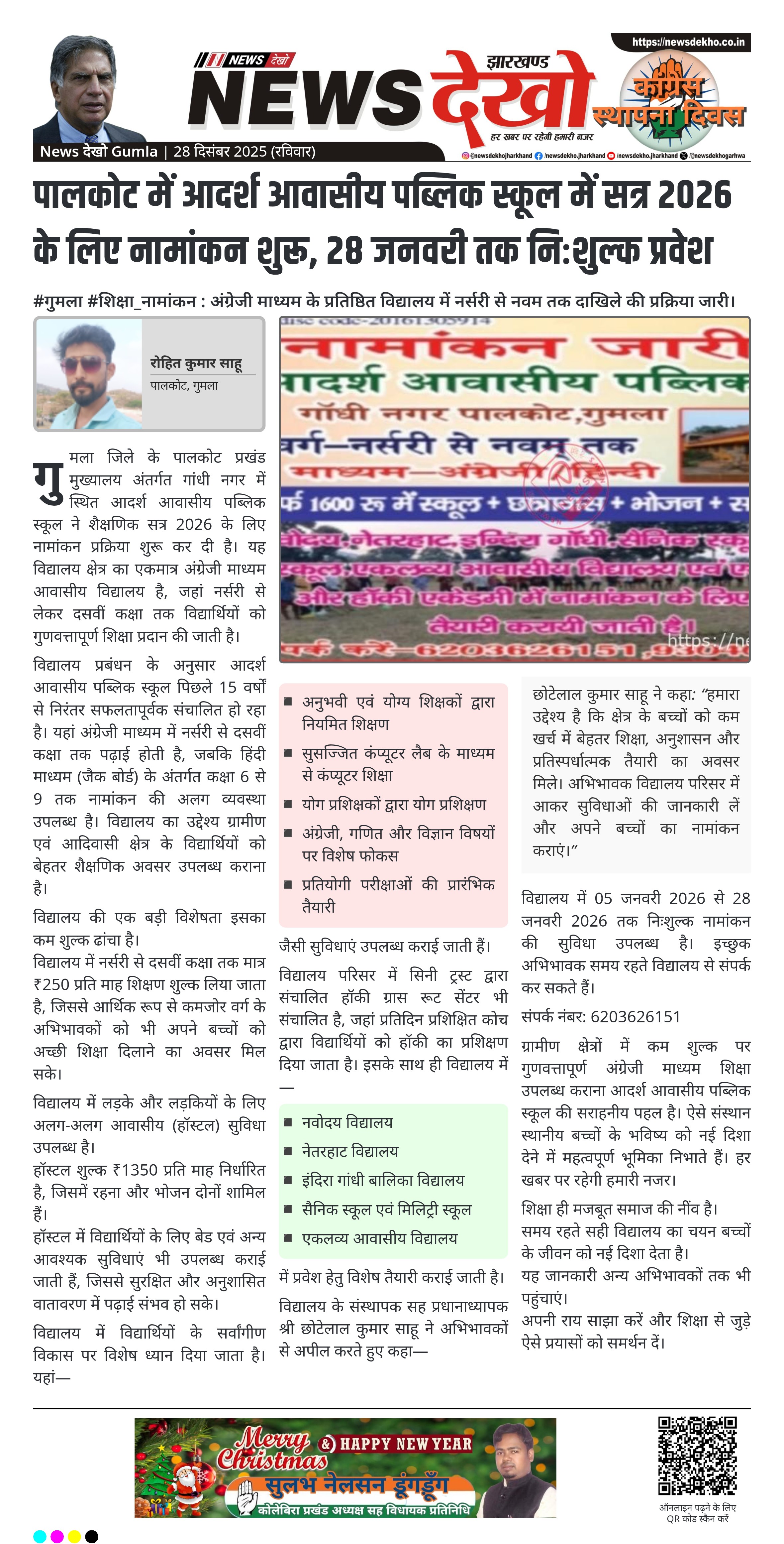 गुमला जिले के पालकोट प्रखंड मुख्यालय स्थित आदर्श आवासीय पब्लिक स्कूल में शैक्षणिक सत्र 2026 के लिए नामांकन प्रक्रिया शुरू कर दी गई है। विद्यालय प्रबंधन के अनुसार नर्सरी से नवम कक्षा तक विद्यार्थियों का नामांकन लिया जा रहा है, जिसमें 28 जनवरी 2026 तक निःशुल्क प्रवेश की सुविधा उपलब्ध है। पिछले 15 वर्षों से संचालित यह विद्यालय क्षेत्र में गुणवत्तापूर्ण अंग्रेजी माध्यम शिक्षा के लिए जाना जाता है।