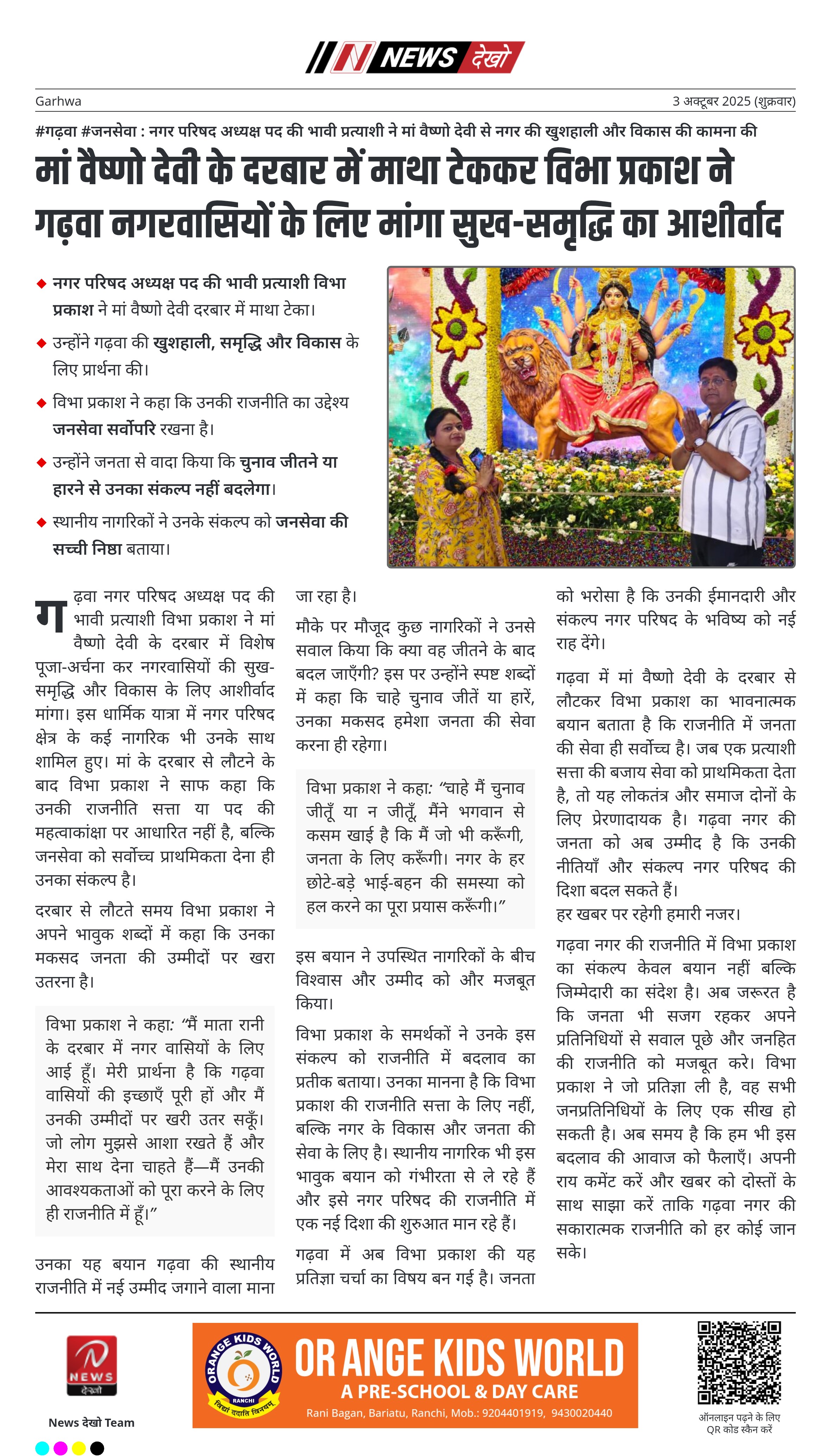 विभा प्रकाश ने कहा: “मैं माता रानी के दरबार में नगर वासियों के लिए आई हूँ। मेरी प्रार्थना है कि गढ़वा वासियों की इच्छाएँ पूरी हों और मैं उनकी उम्मीदों पर खरी उतर सकूँ। जो लोग मुझसे आशा रखते हैं और मेरा साथ देना चाहते हैं—मैं उनकी आवश्यकताओं को पूरा करने के लिए ही राजनीति में हूँ।”