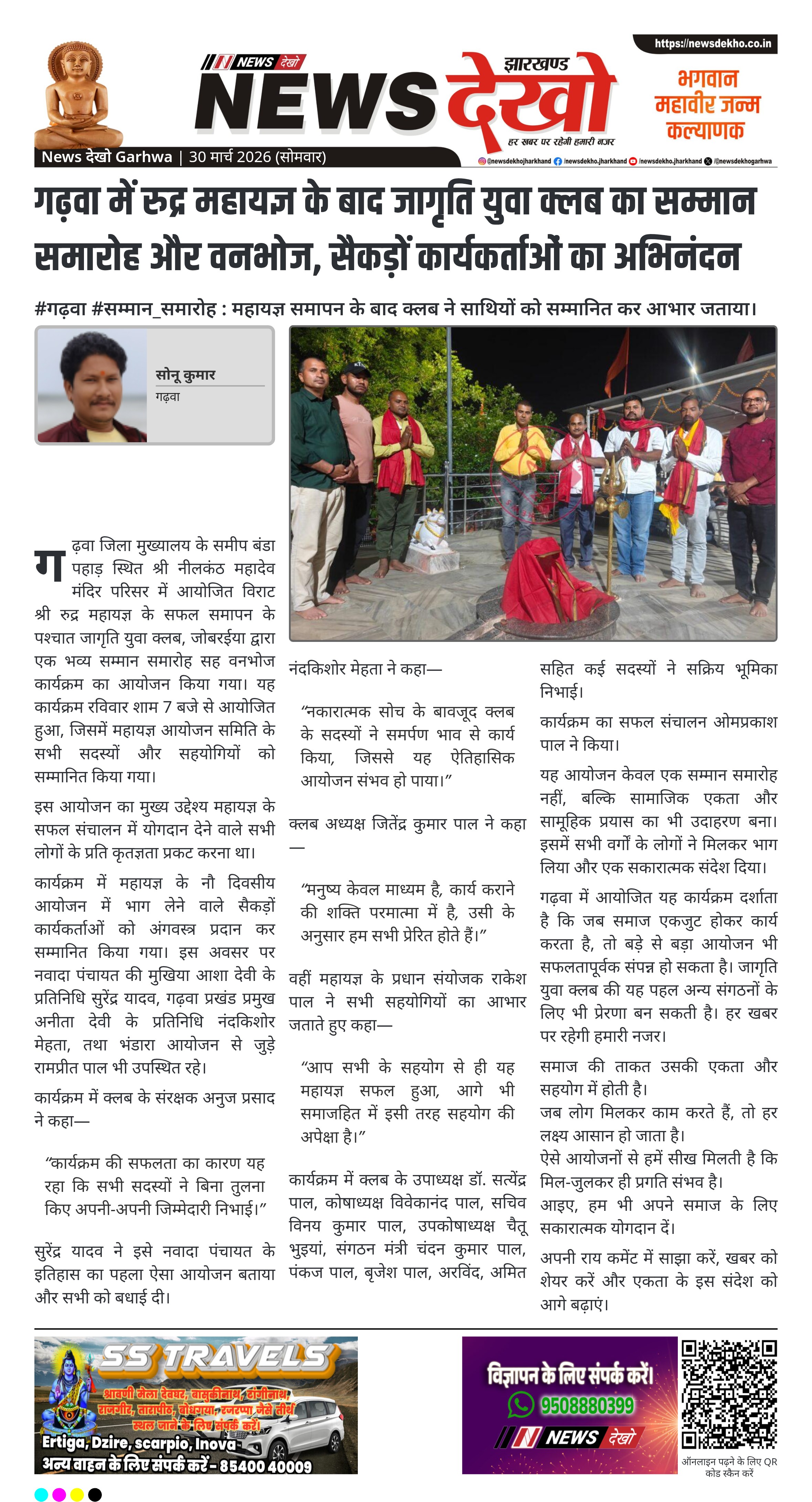गढ़वा जिला मुख्यालय के समीप बंडा पहाड़ स्थित श्री नीलकंठ महादेव मंदिर परिसर में आयोजित विराट श्री रुद्र महायज्ञ के सफल समापन के पश्चात जागृति युवा क्लब, जोबरईया द्वारा एक भव्य सम्मान समारोह सह वनभोज कार्यक्रम का आयोजन किया गया। यह कार्यक्रम रविवार शाम 7 बजे से आयोजित हुआ, जिसमें महायज्ञ आयोजन समिति के सभी सदस्यों और सहयोगियों को सम्मानित किया गया।