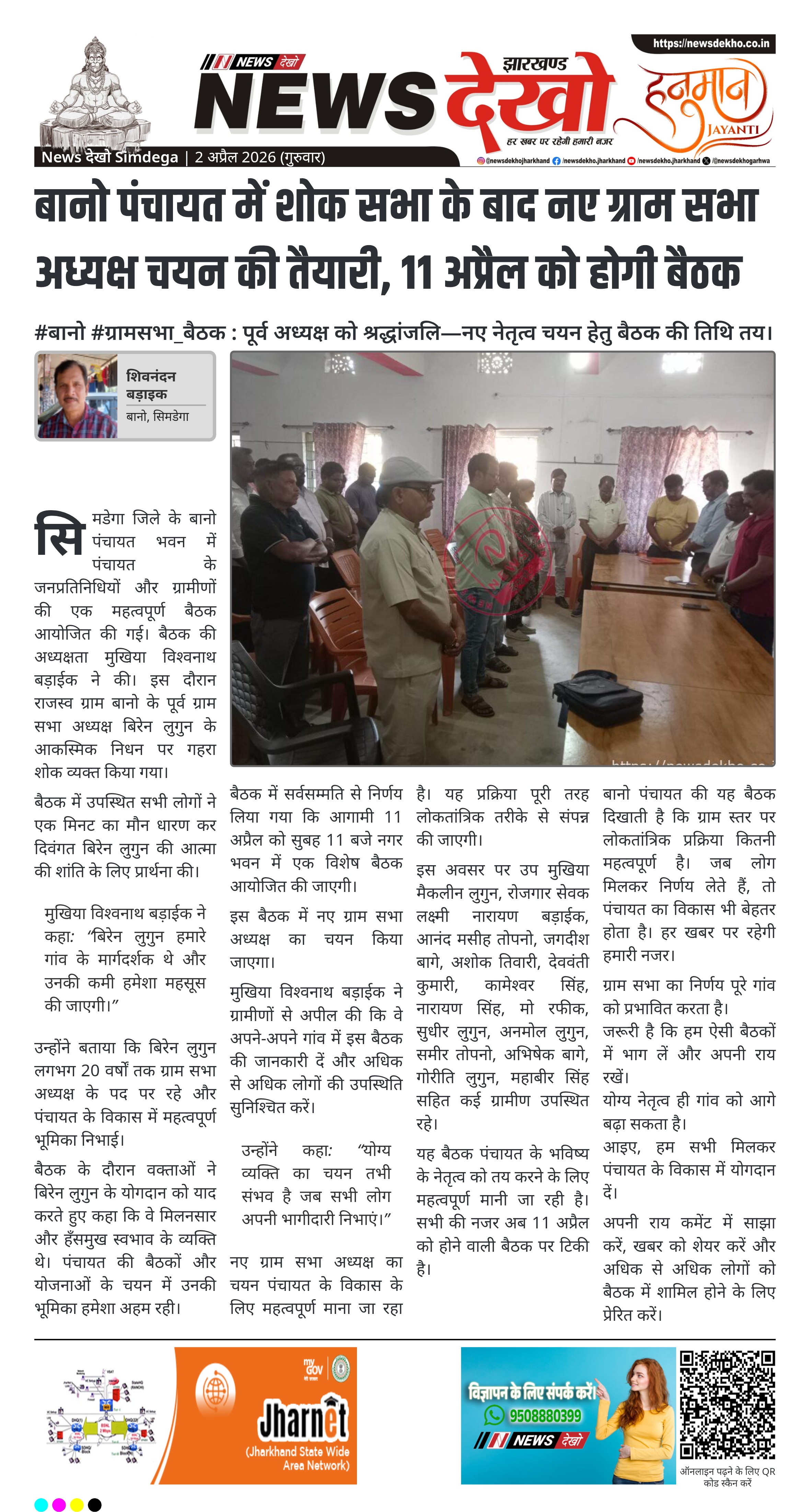 सिमडेगा के बानो पंचायत भवन में जनप्रतिनिधियों और ग्रामीणों की बैठक आयोजित हुई, जिसमें पूर्व ग्राम सभा अध्यक्ष बिरेन लुगुन के निधन पर शोक व्यक्त किया गया। बैठक में 11 अप्रैल को नए अध्यक्ष के चयन के लिए नगर भवन में सभा आयोजित करने का निर्णय लिया गया। ग्रामीणों से अधिकाधिक भागीदारी की अपील की गई। यह बैठक पंचायत के भविष्य के नेतृत्व को तय करेगी।