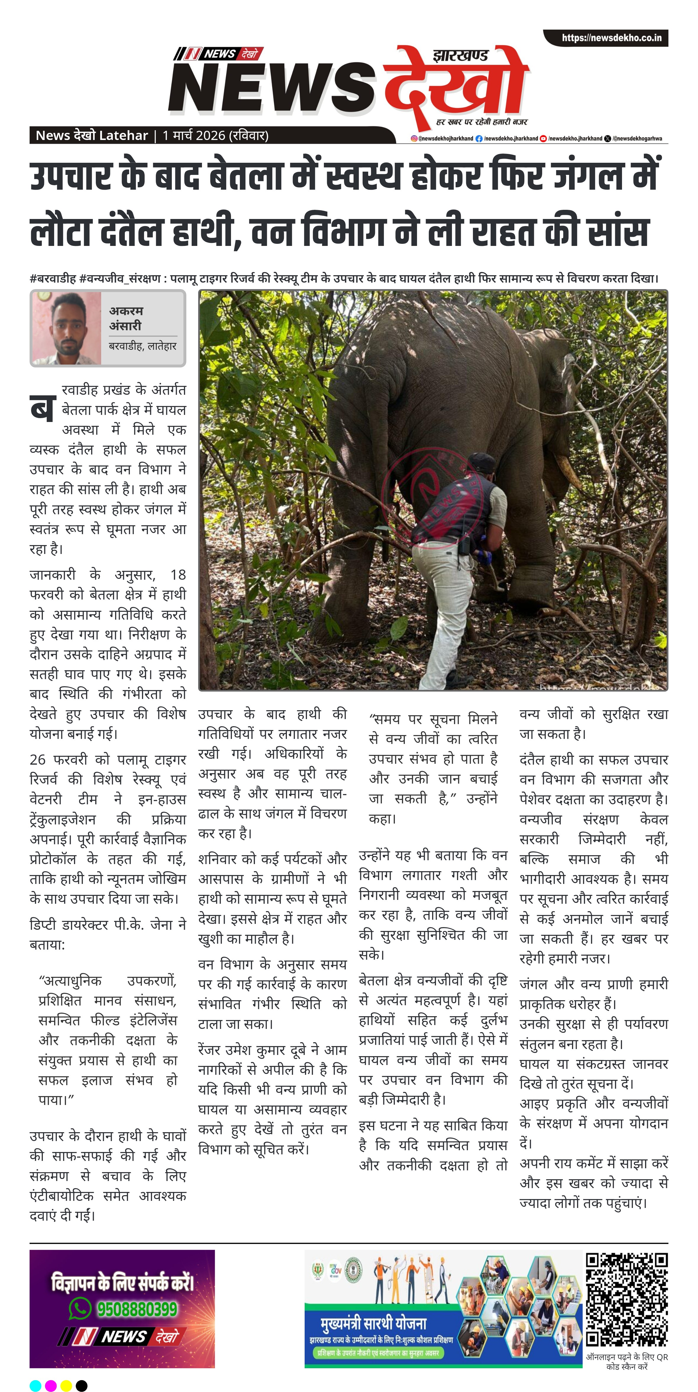 बरवाडीह स्थित बेतला पार्क क्षेत्र में घायल मिले एक व्यस्क दंतैल हाथी का सफल उपचार कर वन विभाग ने बड़ी राहत महसूस की है। पलामू टाइगर रिजर्व की विशेष रेस्क्यू एवं वेटनरी टीम ने वैज्ञानिक प्रक्रिया से इलाज किया। अब हाथी पूरी तरह स्वस्थ होकर जंगल में सामान्य रूप से विचरण कर रहा है।