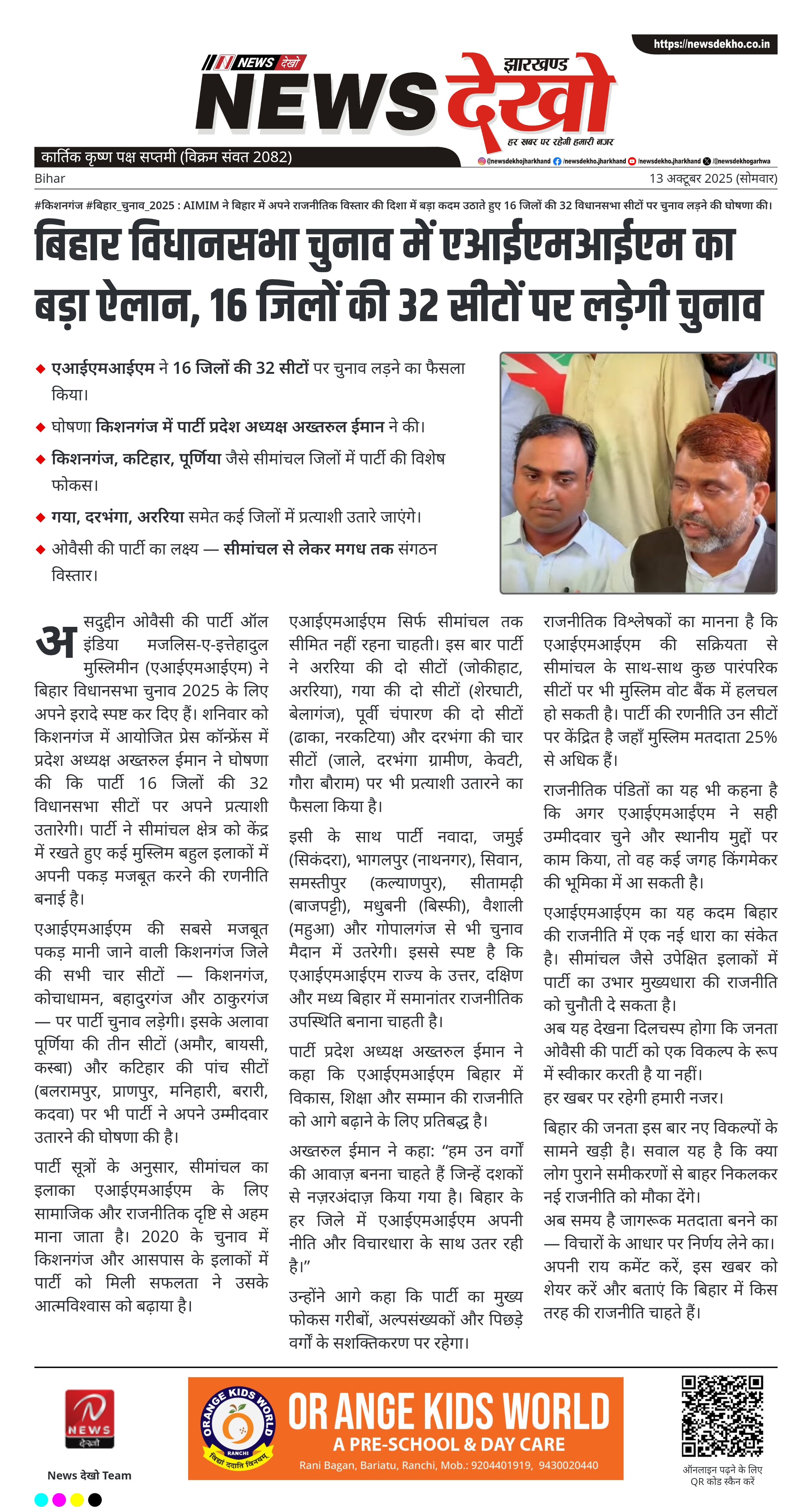 #किशनगंज #बिहार_चुनाव_2025 : AIMIM ने बिहार में अपने राजनीतिक विस्तार की दिशा में बड़ा कदम उठाते हुए 16 जिलों की 32 विधानसभा सीटों पर चुनाव लड़ने की घोषणा की।