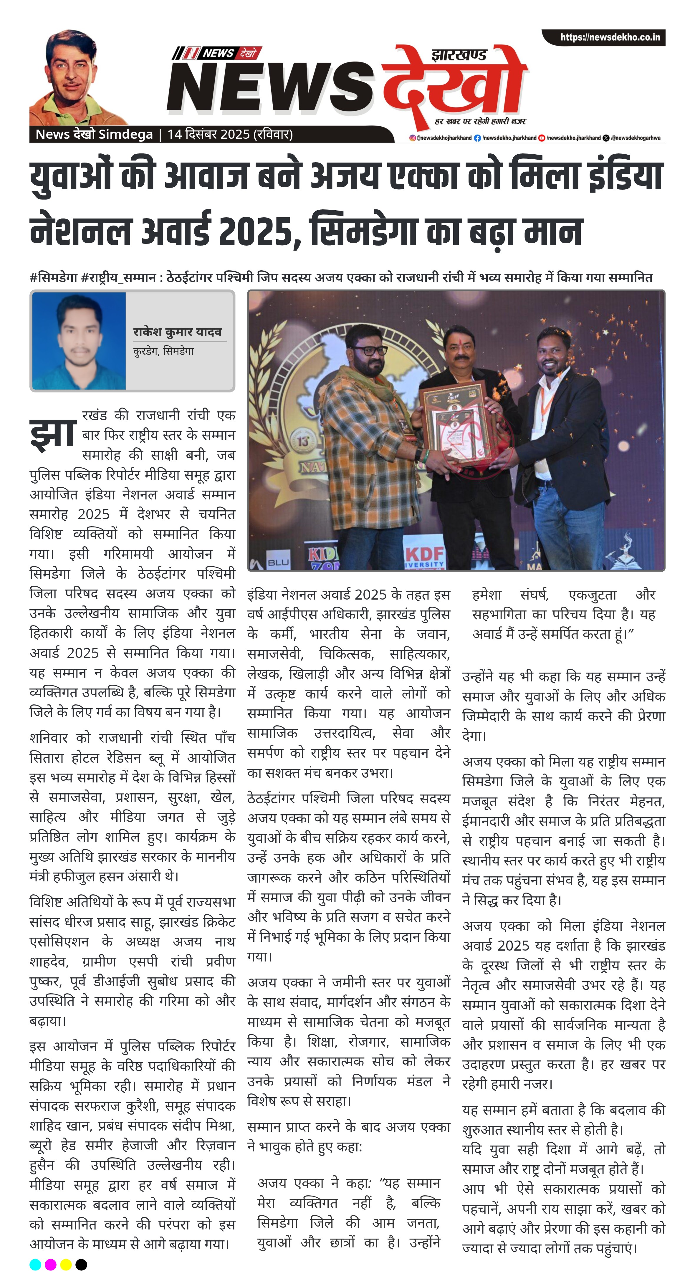 - अजय एक्का को मिला इंडिया नेशनल अवार्ड 2025।