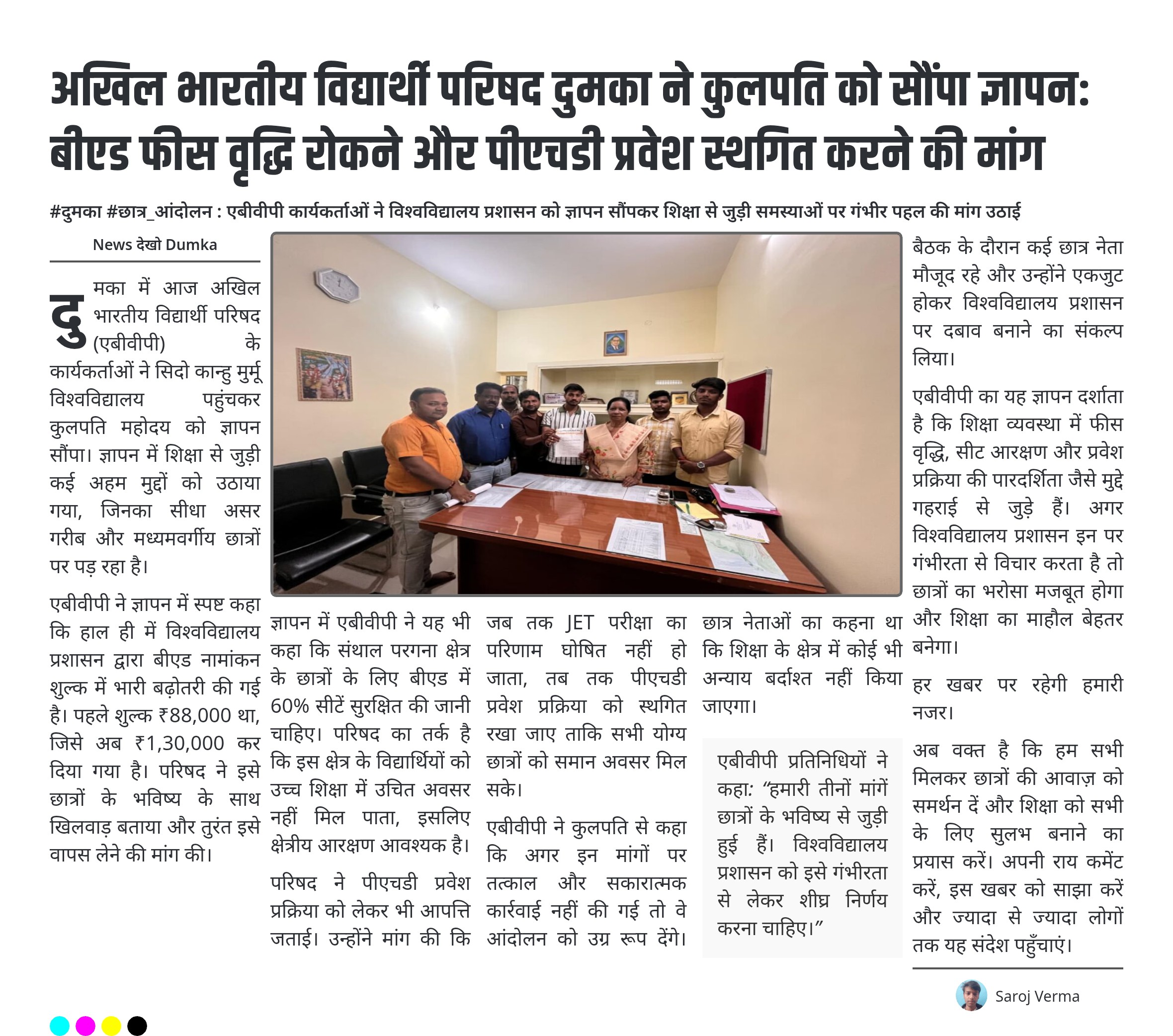 - एबीवीपी दुमका इकाई ने 15 सितंबर 2025 को सिदो कान्हु मुर्मू विश्वविद्यालय के कुलपति को ज्ञापन सौंपा।