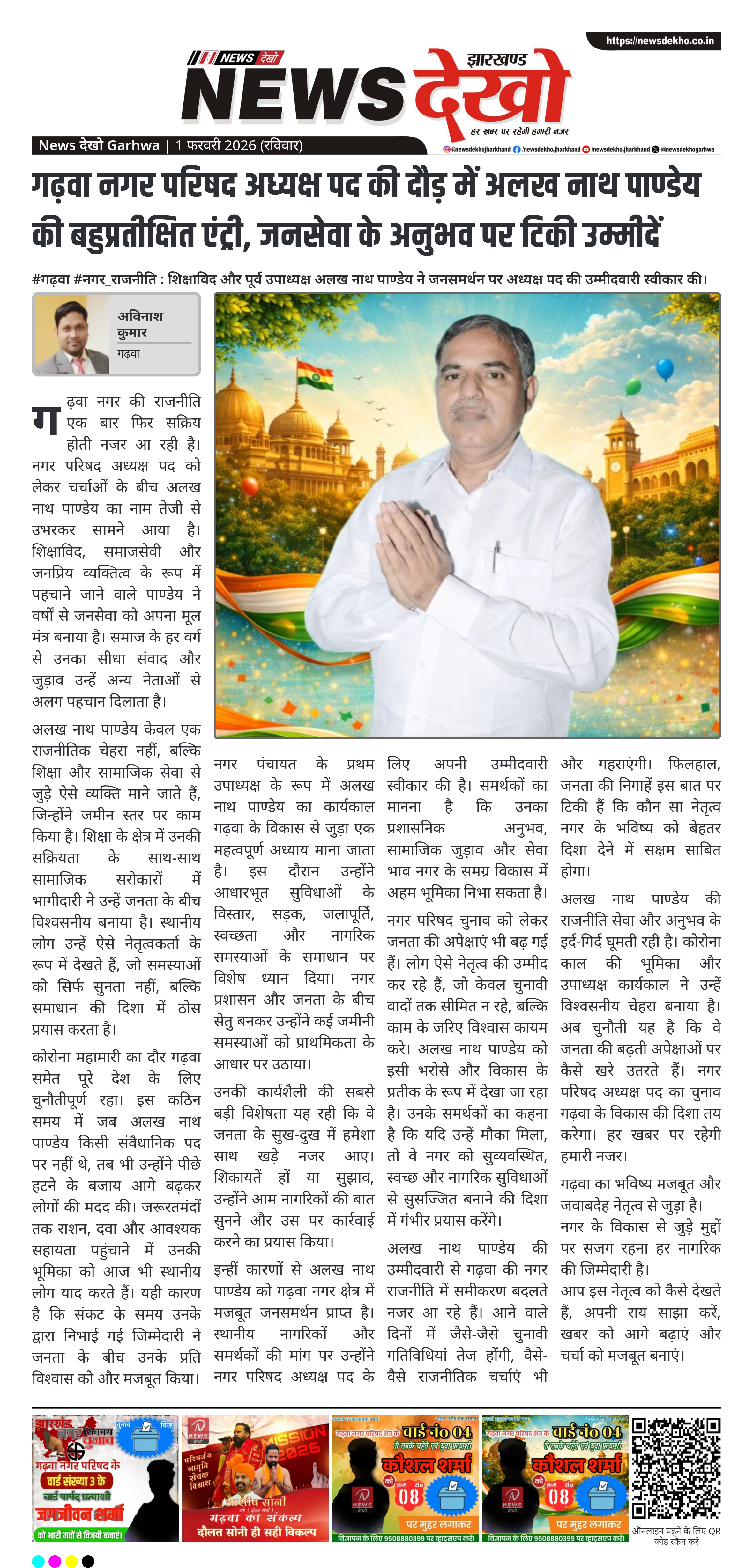 गढ़वा नगर परिषद अध्यक्ष पद के लिए सामाजिक कार्यों में लंबे समय से सक्रिय अलख नाथ पाण्डेय ने अपनी उम्मीदवारी स्वीकार कर ली है। शिक्षाविद और समाजसेवी के रूप में पहचाने जाने वाले पाण्डेय को जनता के बीच मजबूत पकड़ वाला नेता माना जाता है। कोरोना काल से लेकर नगर पंचायत के प्रथम उपाध्यक्ष कार्यकाल तक उनकी सक्रिय भूमिका चर्चा में रही है। उनके चुनावी मैदान में उतरने से गढ़वा की स्थानीय राजनीति में नई हलचल देखी जा रही है।