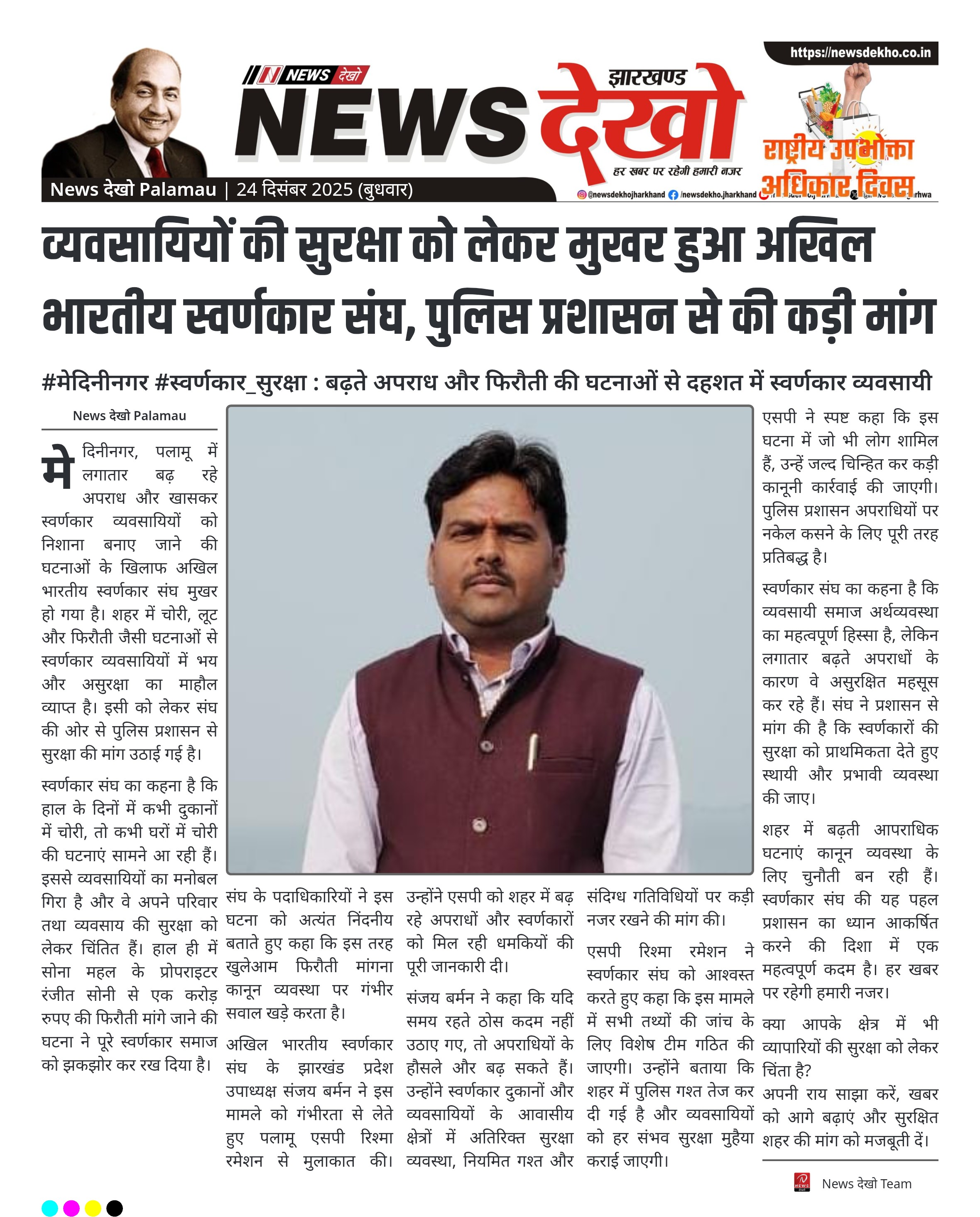 #मेदिनीनगर #स्वर्णकार_सुरक्षा : बढ़ते अपराध और फिरौती की घटनाओं से दहशत में स्वर्णकार व्यवसायी