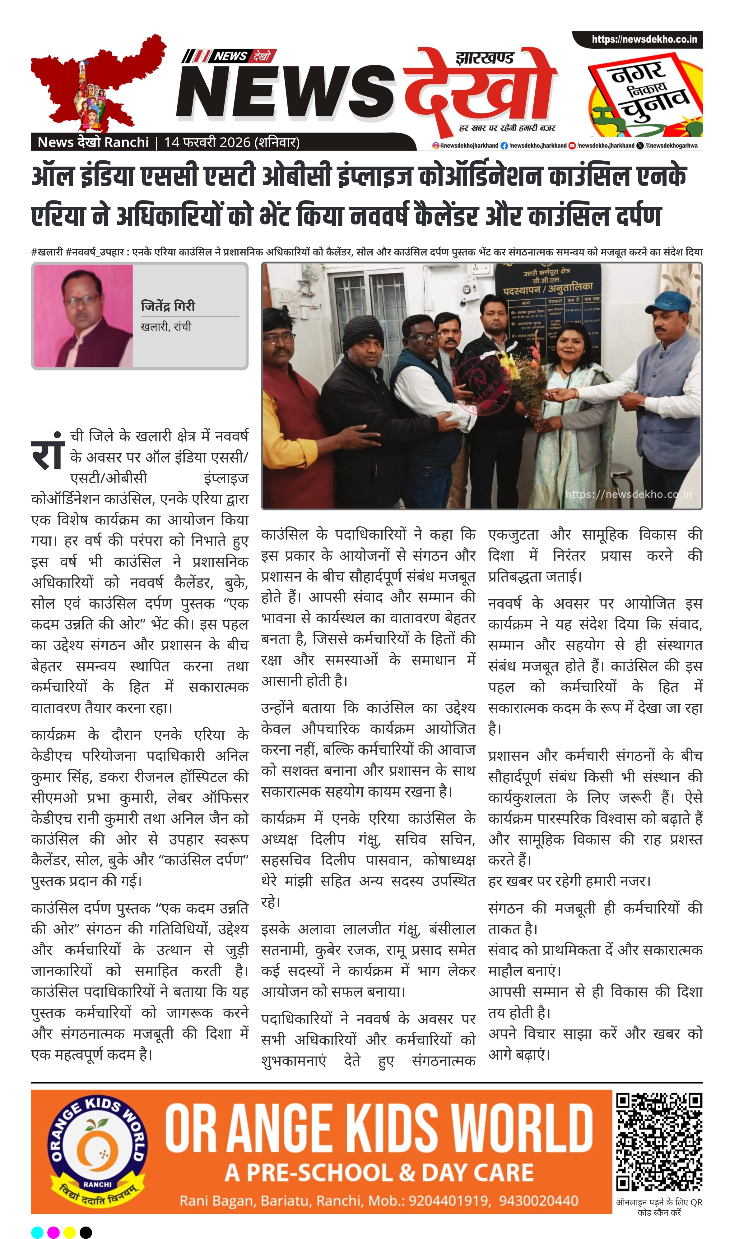 रांची जिले के खलारी क्षेत्र में ऑल इंडिया एससी/एसटी/ओबीसी इंप्लाइज कोऑर्डिनेशन काउंसिल, एनके एरिया ने नववर्ष के अवसर पर अधिकारियों से मुलाकात कर कैलेंडर, सोल और “काउंसिल दर्पण” पुस्तक भेंट की। कार्यक्रम के माध्यम से संगठन और प्रशासन के बीच बेहतर समन्वय का संदेश दिया गया।