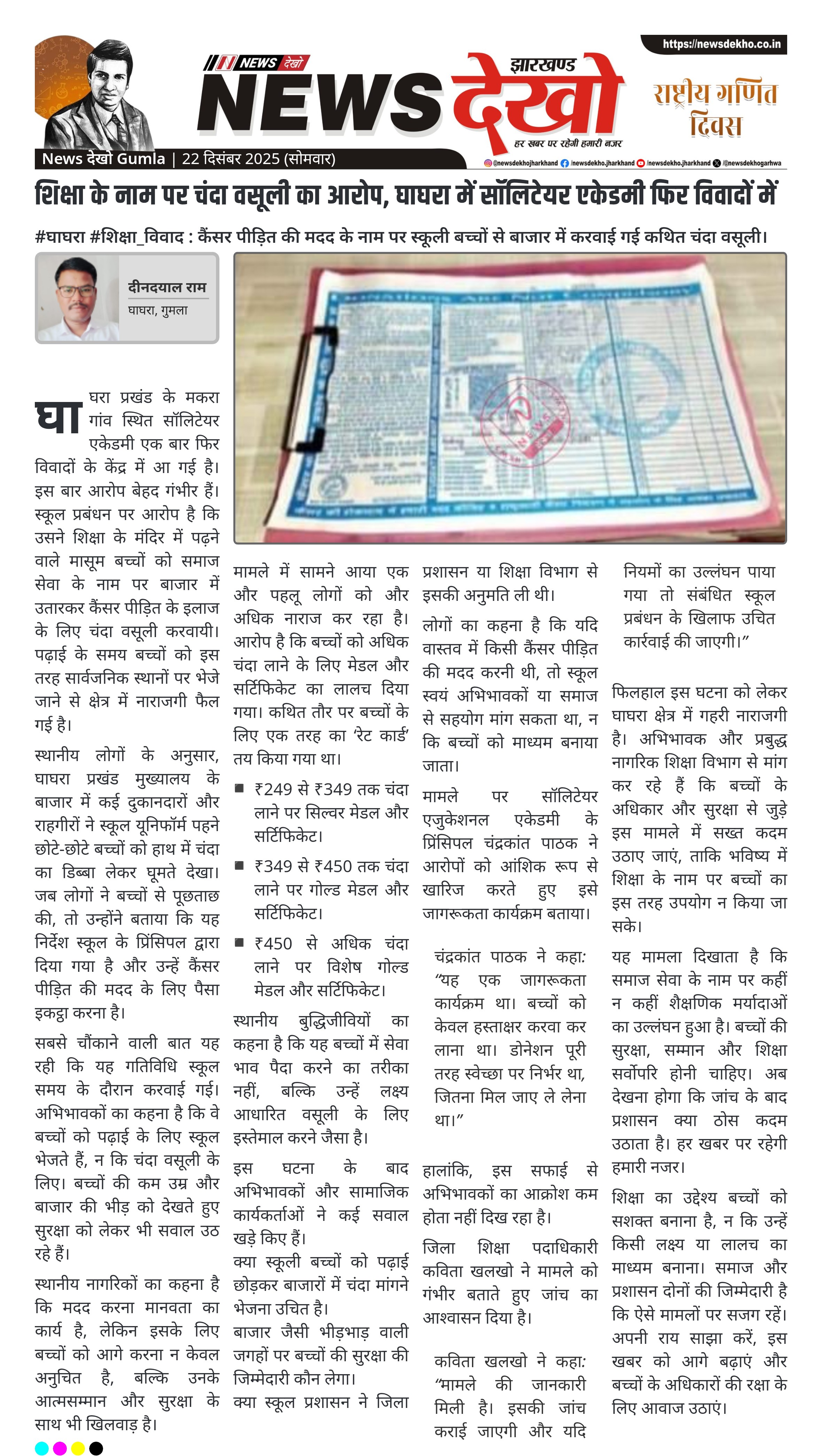 • सॉलिटेयर एकेडमी, मकरा गांव पर बच्चों से चंदा वसूली का आरोप।