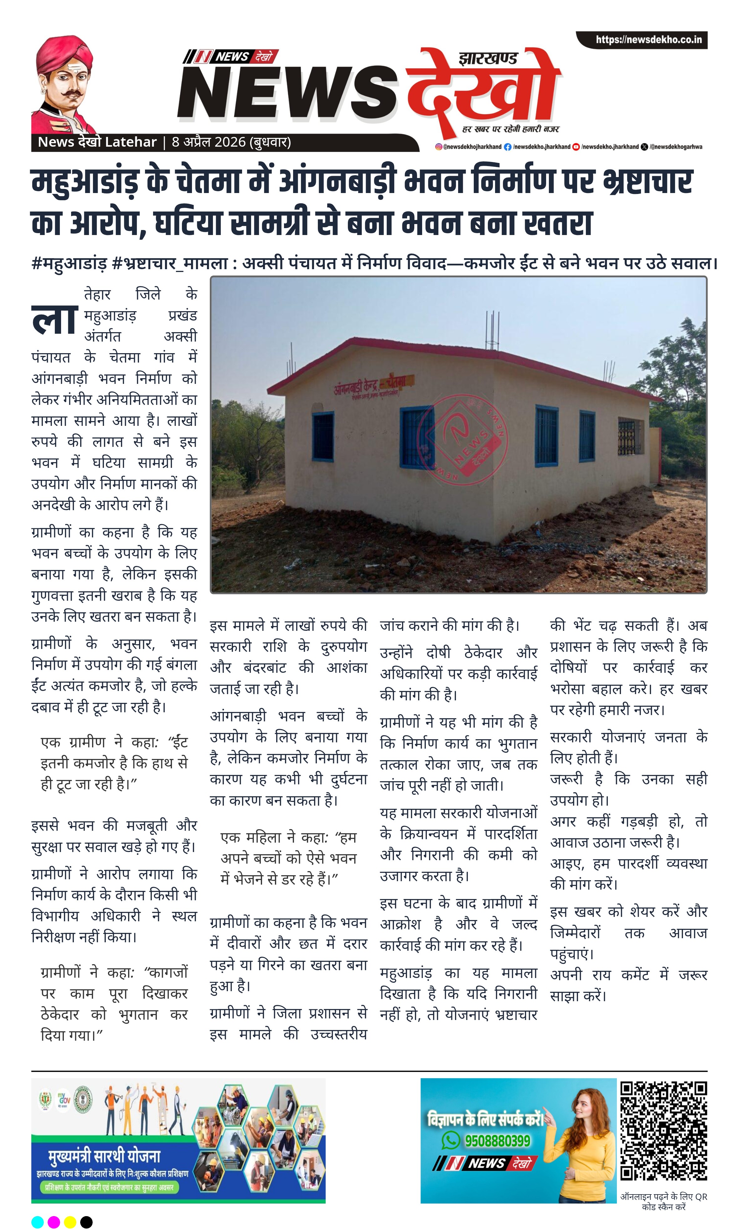 लातेहार जिले के महुआडांड़ प्रखंड अंतर्गत अक्सी पंचायत के चेतमा गांव में आंगनबाड़ी भवन निर्माण को लेकर गंभीर अनियमितताओं का मामला सामने आया है। लाखों रुपये की लागत से बने इस भवन में घटिया सामग्री के उपयोग और निर्माण मानकों की अनदेखी के आरोप लगे हैं।
