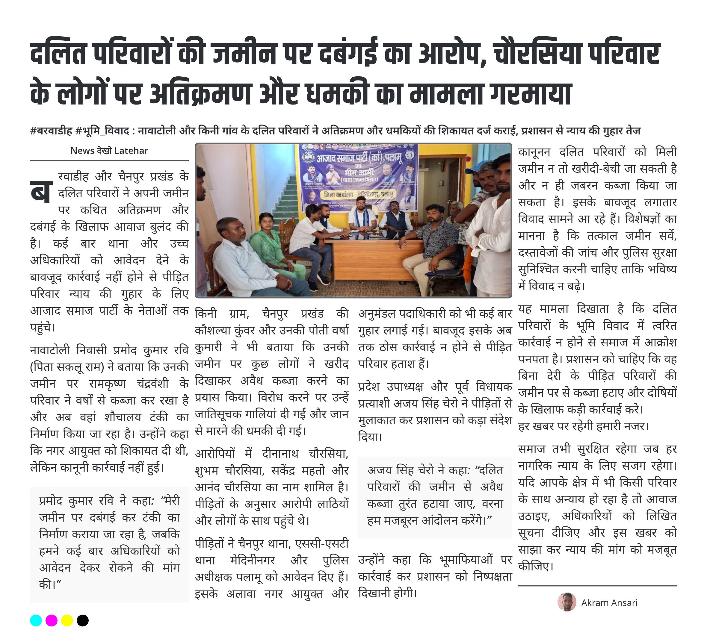बरवाडीह और चैनपुर प्रखंड के दलित परिवारों ने अपनी जमीन पर कथित अतिक्रमण और दबंगई के खिलाफ आवाज बुलंद की है। कई बार थाना और उच्च अधिकारियों को आवेदन देने के बावजूद कार्रवाई नहीं होने से पीड़ित परिवार न्याय की गुहार के लिए आजाद समाज पार्टी के नेताओं तक पहुंचे।