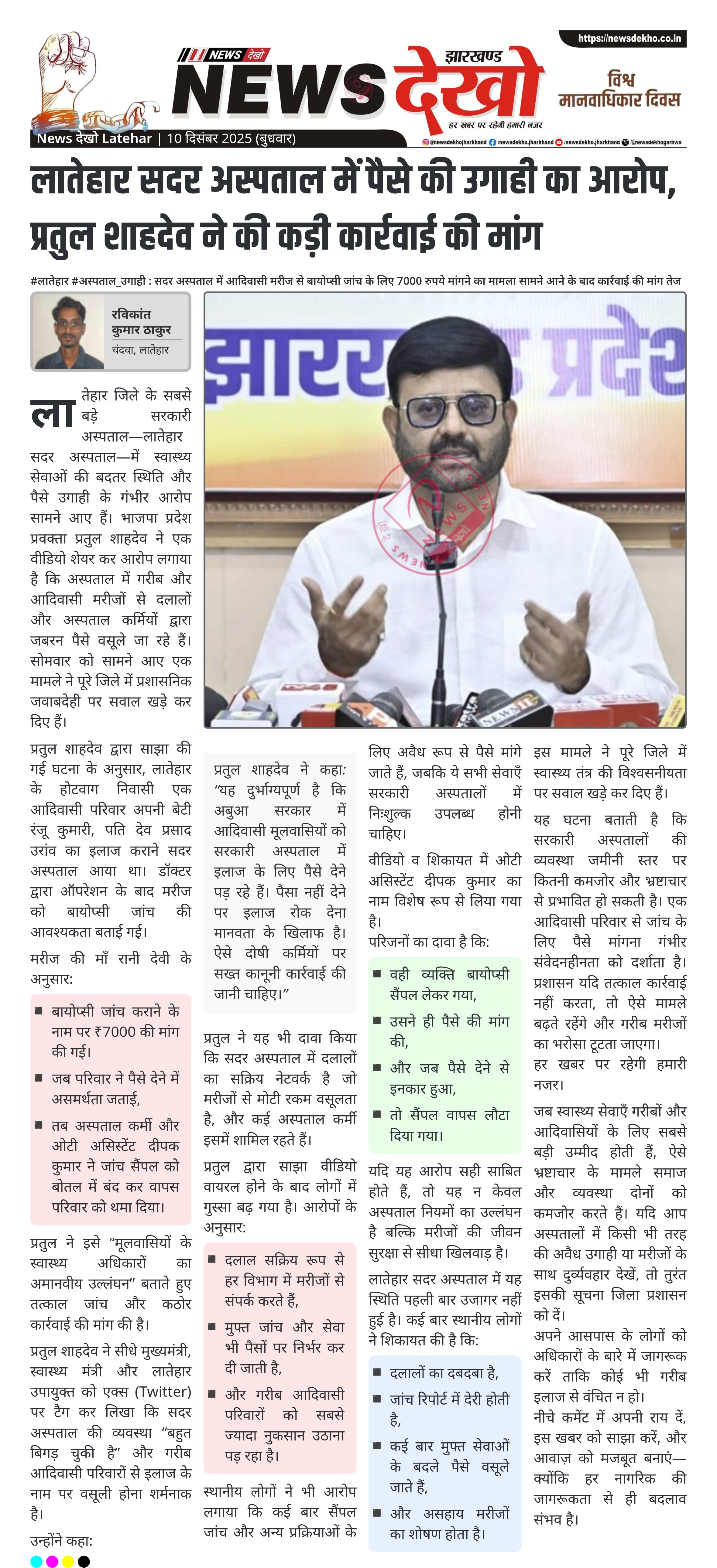 लातेहार जिले के सबसे बड़े सरकारी अस्पताल—लातेहार सदर अस्पताल—में स्वास्थ्य सेवाओं की बदतर स्थिति और पैसे उगाही के गंभीर आरोप सामने आए हैं। भाजपा प्रदेश प्रवक्ता प्रतुल शाहदेव ने एक वीडियो शेयर कर आरोप लगाया है कि अस्पताल में गरीब और आदिवासी मरीजों से दलालों और अस्पताल कर्मियों द्वारा जबरन पैसे वसूले जा रहे हैं। सोमवार को सामने आए एक मामले ने पूरे जिले में प्रशासनिक जवाबदेही पर सवाल खड़े कर दिए हैं।